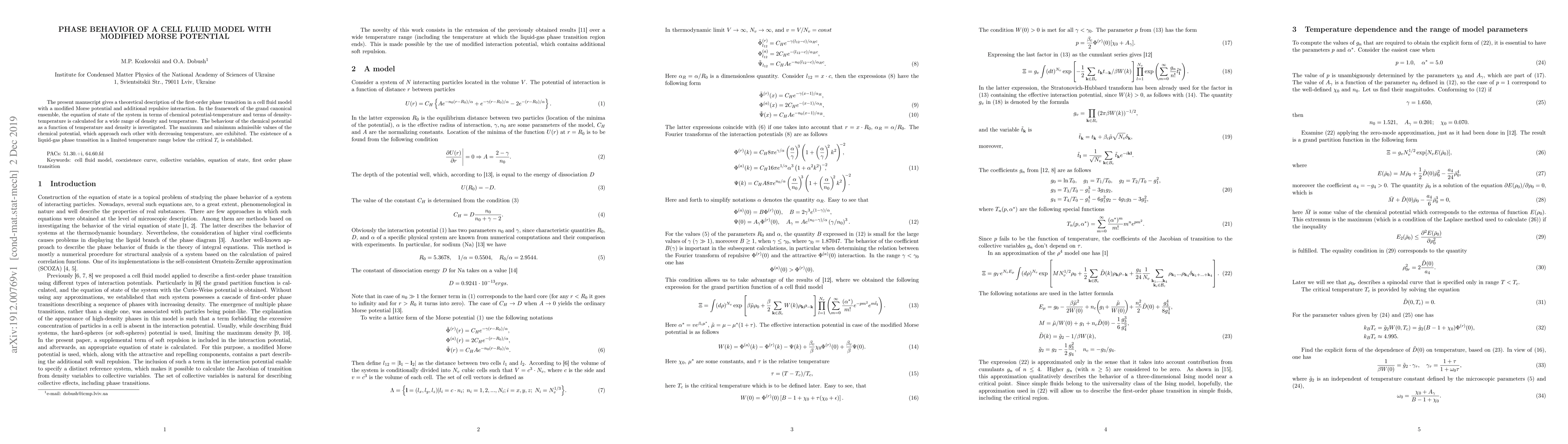 The present manuscript gives a theoretical description of the first-order phase transition in a cell fluid model with a modified Morse potential and additional repulsive interaction. In the framework of the grand canonical ensemble, the equation of state of the system in terms of chemical potential-temperature and terms of density-temperature is calculated for a wide range of density and temperature. The behavior of the chemical potential as a function of temperature and density is investigated. The maximum and minimum admissible values of the chemical potential, which approach each other with decreasing temperature, are exhibited. The existence of a liquid-gas phase transition in a limited temperature range below the critical $T_c$ is established.