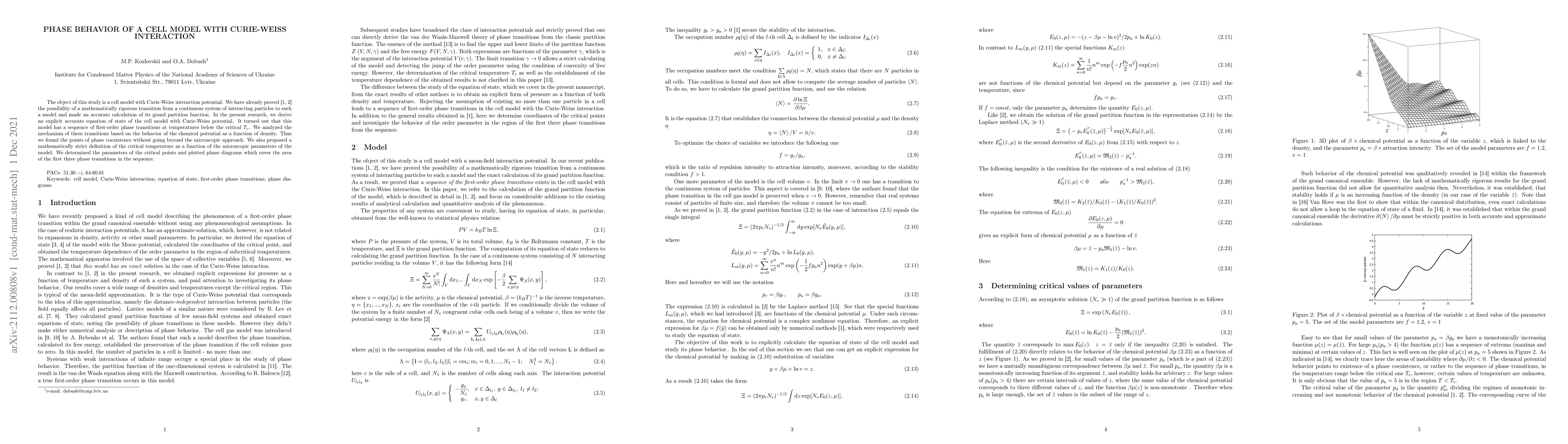 This paper investigates a cell model with Curie-Weiss interaction, deriving an accurate equation of state and identifying a sequence of first-order phase transitions below the critical temperature. The study analyzes the phase coexistence mechanism and proposes a strict definition of the critical temperature, determining critical point parameters and plotting phase diagrams.