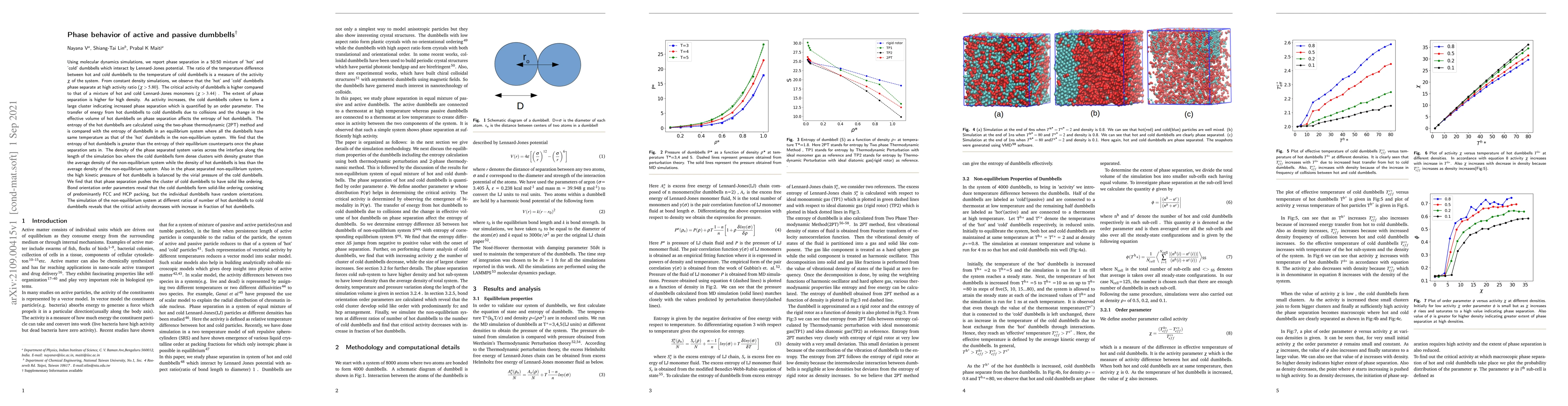 This study uses molecular dynamics simulations to investigate phase separation in a mixture of active (hot) and passive (cold) dumbbells, finding that phase separation occurs at high activity ratios ($\chi > 5.80$). The critical activity for dumbbells is higher than for monomers, and the extent of phase separation is greater at higher densities.