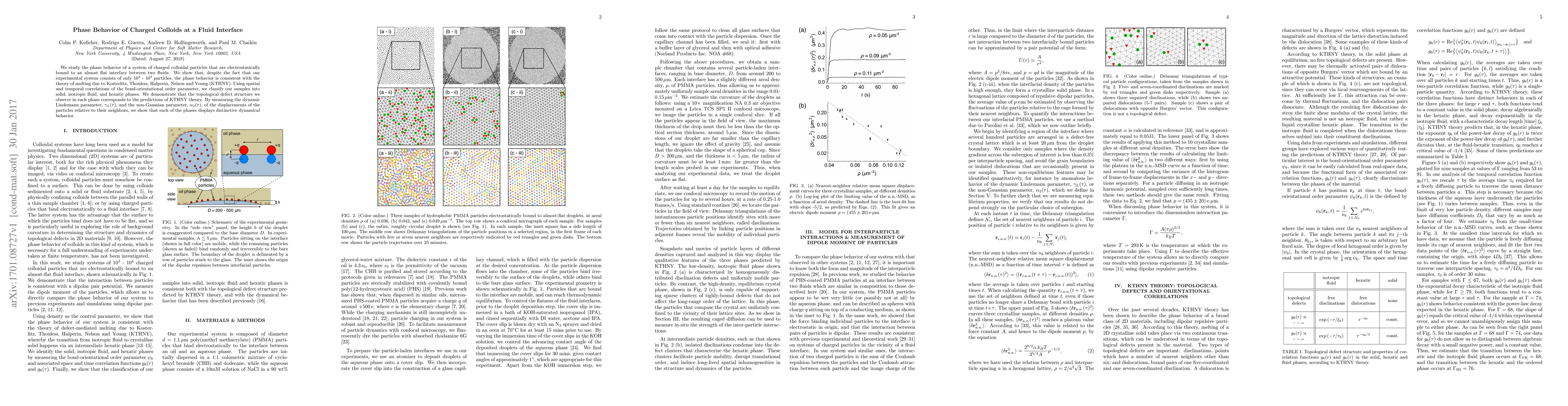 We study the phase behavior of a system of charged colloidal particles that are electrostatically bound to an almost flat interface between two fluids. We show that, despite the fact that our experimental system consists of only $10^{3}$ - $10^{4}$ particles, the phase behavior is consistent with the theory of melting due to Kosterlitz, Thouless, Halperin, Nelson and Young (KTHNY). Using spatial and temporal correlations of the bond-orientational order parameter, we classify our samples into solid, isotropic fluid, and hexatic phases. We demonstrate that the topological defect structure we observe in each phase corresponds to the predictions of KTHNY theory. By measuring the dynamic Lindemann parameter, $\gamma_{L}(\tau)$, and the non-Gaussian parameter, $\alpha_{2}(\tau)$, of the displacements of the particles relative to their neighbors, we show that each of the phases displays distinctive dynamical behavior.