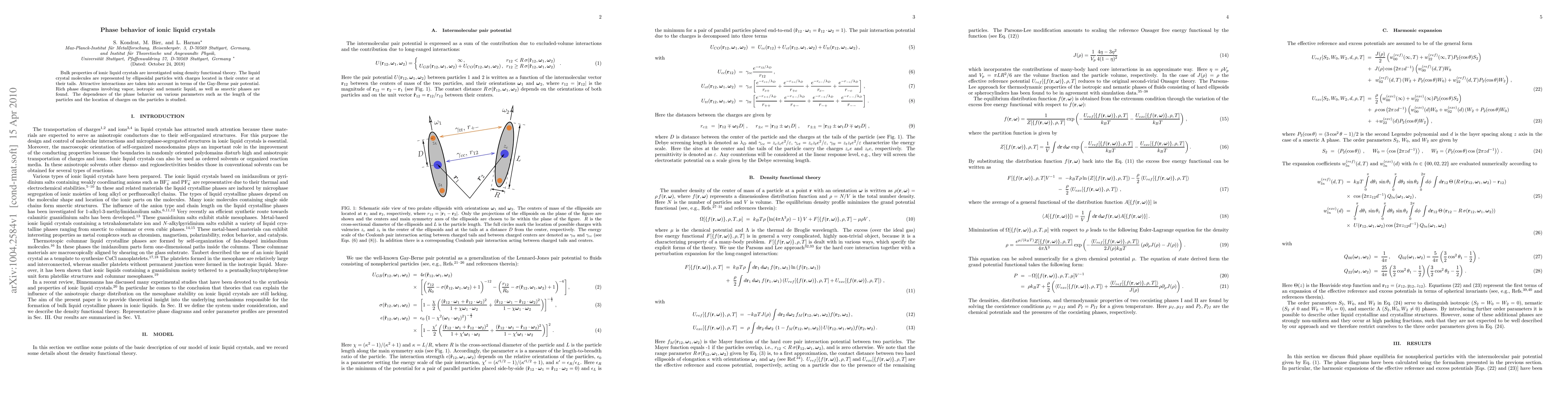 This study investigates the phase behavior of ionic liquid crystals using density functional theory, revealing complex phase diagrams including vapor, isotropic, nematic, and smectic phases, influenced by particle length and charge location.