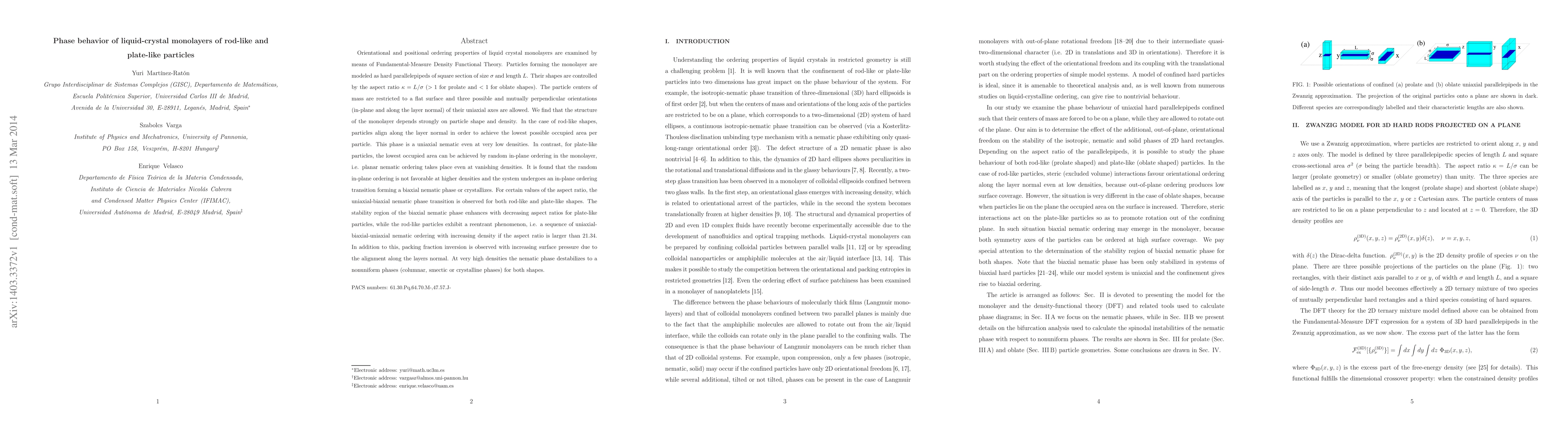 This study explores the phase behavior of liquid-crystal monolayers using Density Functional Theory, revealing that rod-like particles exhibit uniaxial nematic ordering even at low densities, while plate-like particles show planar nematic ordering at low densities transitioning to biaxial nematic or crystalline phases at higher densities.