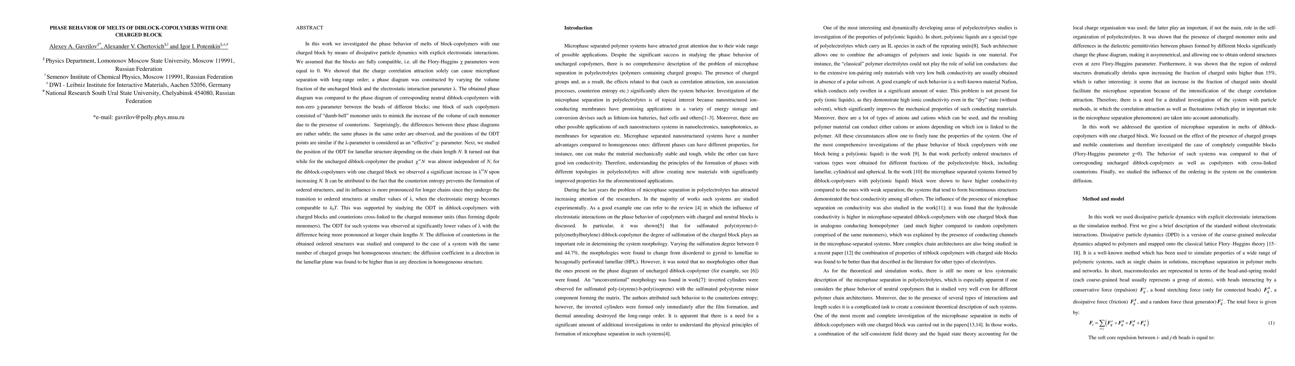 In this work we investigated the phase behavior of melts of block-copolymers with one charged block by means of dissipative particle dynamics with explicit electrostatic interactions. We assumed that all the Flory-Huggins \c{hi} parameters were equal to 0 and showed that the charge correlation attraction solely can cause microphase separation with long-range order; a phase diagram was constructed by varying the volume fraction of the uncharged block and the electrostatic interaction parameter {\lambda}. The obtained phase diagram was compared to the phase diagram of corresponding neutral diblock-copolymers. Surprisingly, the differences between these phase diagrams are rather subtle; the same phases are observed, and the positions of the ODT points are similar if the {\lambda}-parameter is considered as an "effective" \c{hi}-parameter. Next, we studied the position of the ODT for lamellar structure depending on the chain length N. It turned out that while for the uncharged diblock-copolymer the product \c{hi}crN was almost independent of N, for the diblock-copolymers with one charged block we observed a significant increase in {\lambda}crN upon increasing N. It can be attributed to the fact that the counterion entropy prevents the formation of ordered structures. This was supported by studying the ODT in diblock-copolymers with charged blocks and counterions cross-linked to the charged monomer units. The ODT for such systems was observed at significantly lower values of {\lambda} with the difference being more pronounced at longer chain lengths N. The diffusion of counterions in the obtained ordered structures was studied and compared to the case of a system with the same number of charged groups but homogeneous structure; the diffusion coefficient in a direction in the lamellar plane was found to be higher than in any direction in homogeneous structure.