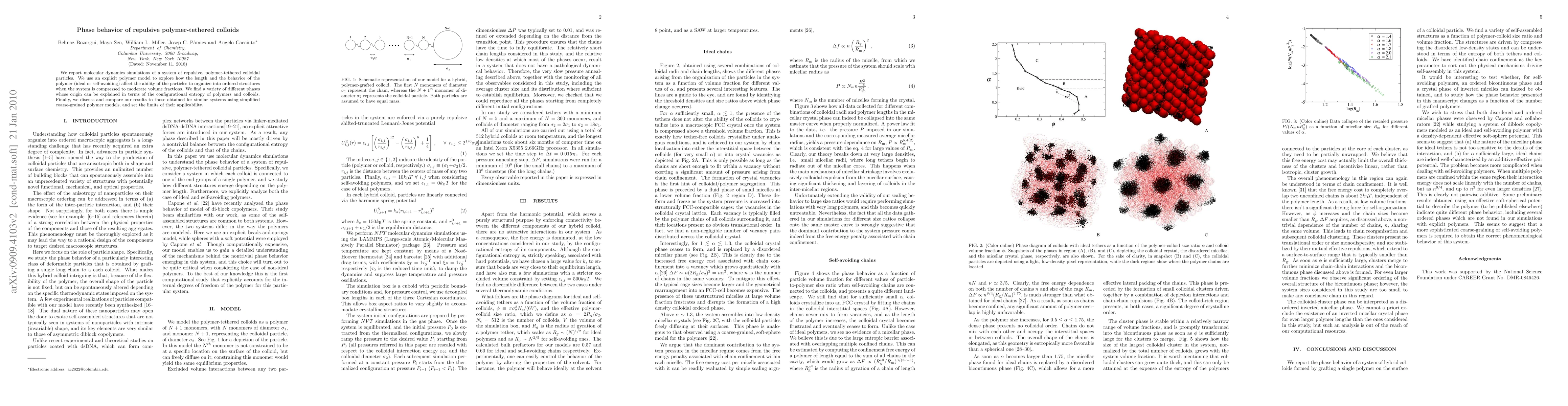 We report molecular dynamics simulations of a system of repulsive, polymer-tethered colloidal particles. We use an explicit polymer model to explore how the length and the behavior of the polymer (ideal or self-avoiding) affect the ability of the particles to organize into ordered structures when the system is compressed to moderate volume fractions. We find a variety of different phases whose origin can be explained in terms of the configurational entropy of polymers and colloids. Finally, we discuss and compare our results to those obtained for similar systems using simplified coarse-grained polymer models, and set the limits of their applicability.