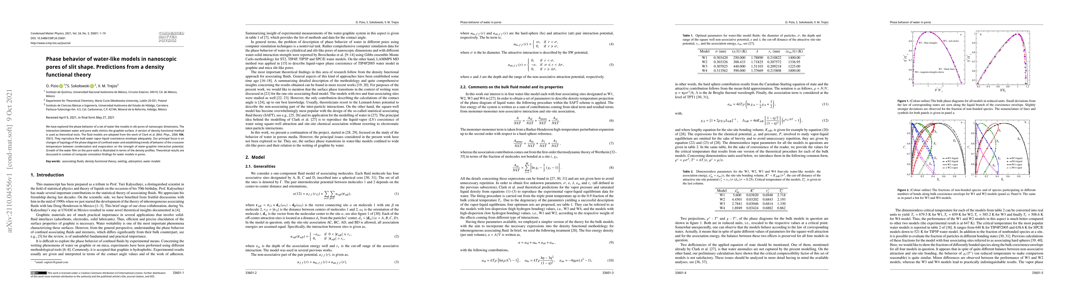 We have explored the phase behavior of a set of water-like models in slit pores of nanoscopic dimensions. The interaction between water and pore walls mimics the graphite surface. A version of density functional method is used as theoretical tools. The fluid models are adopted from the work of Clark et al. [Mol. Phys., 2006, 104, 3561]. They reproduce the bulk water vapor-liquid coexistence envelope adequately. Our principal focus is on changes of topology of the phase diagram of confined water and establishing trends of behavior of the crossover temperature between condensation and evaporation on the strength of water-graphite interaction potential. Growth of the water film on the pore walls is illustrated in terms of the density profiles. Theoretical results are discussed in context of computer simulation findings for water models in pores.