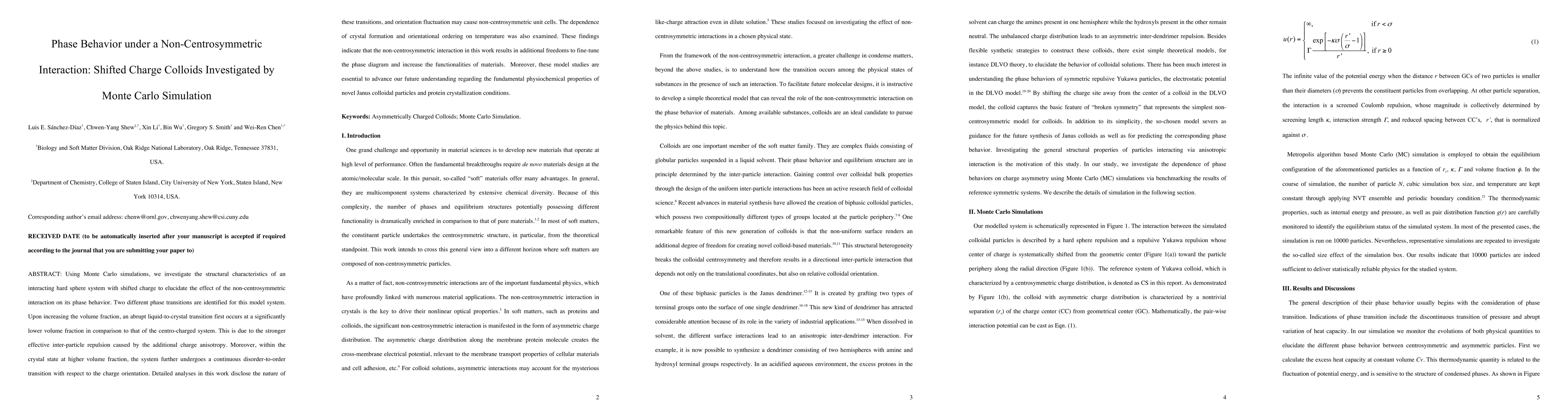 Using Monte Carlo simulations, we investigate the structural characteristics of an interacting hard sphere system with shifted charge to elucidate the effect of the non-centrosymmetric interaction on its phase behavior. Two different phase transitions are identified for this model system. Upon increasing the volume fraction, an abrupt liquid-to-crystal transition first occurs at a significantly lower volume fraction in comparison to that of the centro-charged system. This is due to the stronger effective inter-particle repulsion caused by the additional charge anisotropy. Moreover, within the crystal state at higher volume fraction, the system further undergoes a continuous disorder-to-order transition with respect to the charge orientation. Detailed analyses in this work disclose the nature of these transitions, and orientation fluctuation may cause non-centrosymmetric unit cells. The dependence of crystal formation and orientational ordering on temperature was also examined. These findings indicate that the non-centrosymmetric interaction in this work results in additional freedoms to fine-tune the phase diagram and increase the functionalities of materials. Moreover, these model studies are essential to advance our future understanding regarding the fundamental physiochemical properties of novel Janus colloidal particles and protein crystallization conditions.