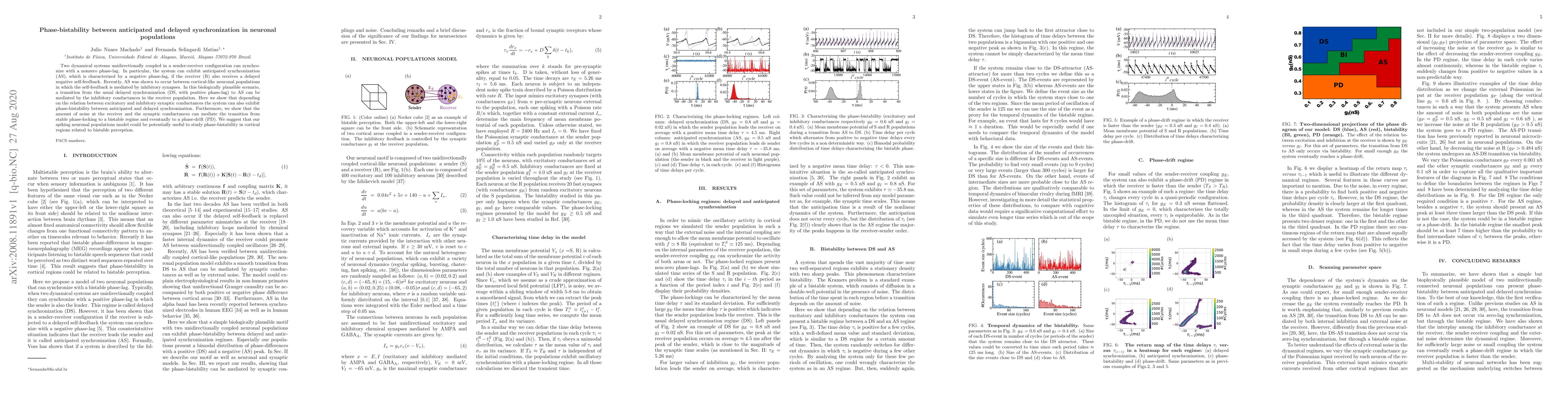 Two dynamical systems unidirectionally coupled in a sender-receiver configuration can synchronize with a nonzero phase-lag. In particular, the system can exhibit anticipated synchronization (AS), which is characterized by a negative phase-lag, if the receiver (R) also receives a delayed negative self-feedback. Recently, AS was shown to occur between cortical-like neuronal populations in which the self-feedback is mediated by inhibitory synapses. In this biologically plausible scenario, a transition from the usual delayed synchronization (DS, with positive phase-lag) to AS can be mediated by the inhibitory conductances in the receiver population. Here we show that depending on the relation between excitatory and inhibitory synaptic conductances the system can also exhibit phase-bistability between anticipated and delayed synchronization. Furthermore, we show that the amount of noise at the receiver and the synaptic conductances can mediate the transition from stable phase-locking to a bistable regime and eventually to a phase-drift (PD). We suggest that our spiking neuronal populations model could be potentially useful to study phase-bistability in cortical regions related to bistable perception.