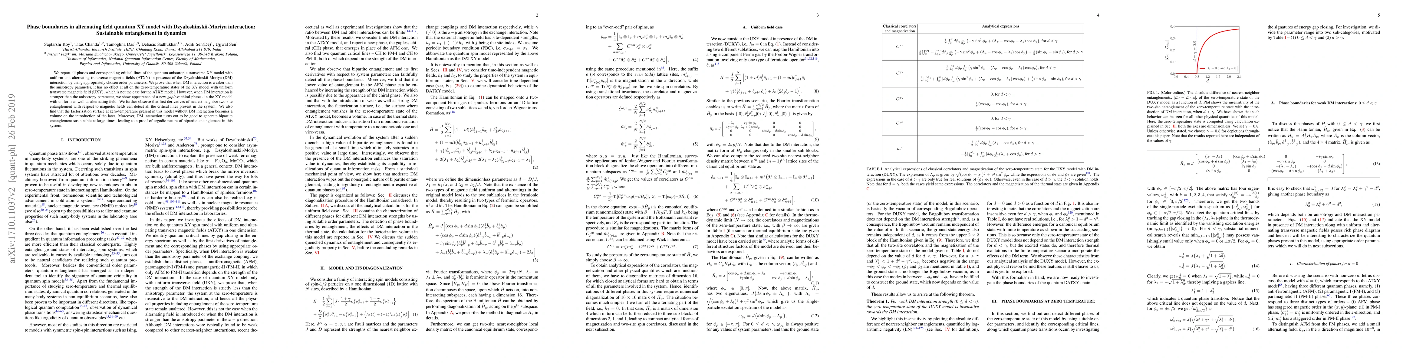 This paper investigates the phase boundaries and critical lines of a quantum XY model with Dzyaloshinskii-Moriya interaction under uniform and alternating magnetic fields, revealing a new chiral phase and sustainable entanglement dynamics. The study shows that entanglement can be detected via first derivatives of two-site entanglement and becomes monotonic with temperature.