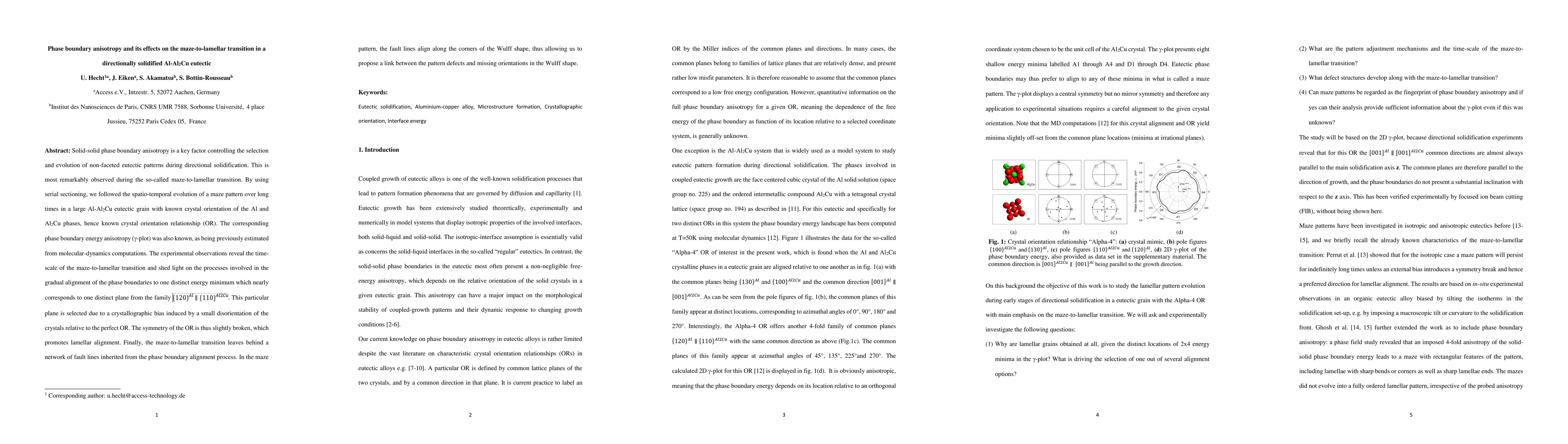 This paper investigates the phase boundary anisotropy's role in the maze-to-lamellar transition in directionally solidified Al-Al2Cu eutectic, revealing the time-scale and processes involved. The study finds that a crystallographic bias slightly breaks the symmetry of the orientation relationship, promoting lamellar alignment and leaving behind a network of fault lines linked to the Wulff shape's missing orientations.