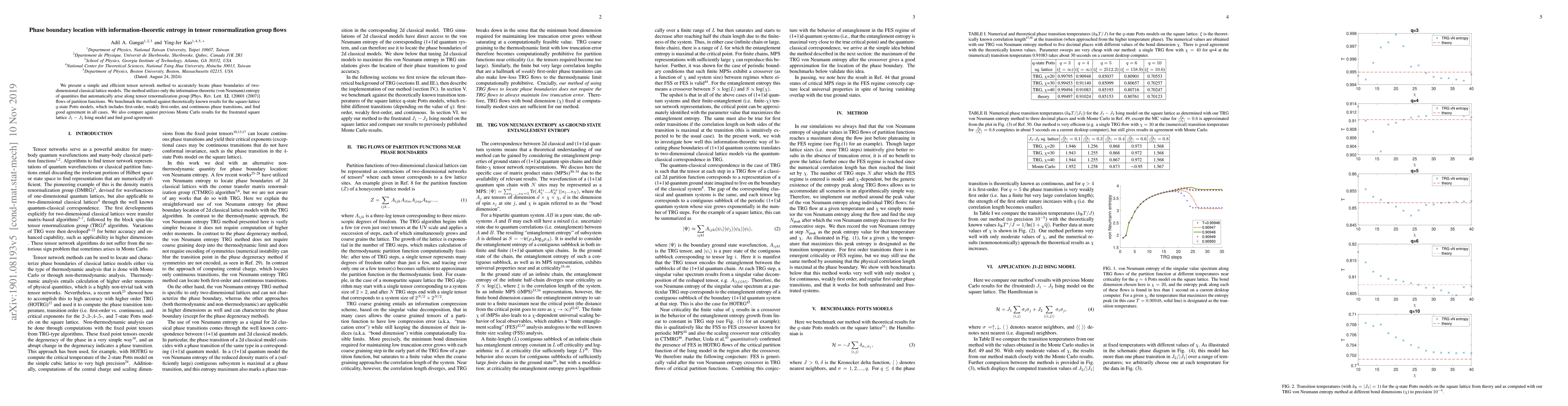We present a simple and efficient tensor network method to accurately locate phase boundaries of two-dimensional classical lattice models. The method utilizes only the information-theoretic (von Neumann) entropy of quantities that automatically arise along tensor renormalization group [Phys. Rev. Lett. \textbf{12}, 120601 (2007)] flows of partition functions. We benchmark the method against theoretically known results for the square-lattice $q$-state Potts models, which includes first-order, weakly first-order, and continuous phase transitions, and find good agreement in all cases. We also compare against previous Monte Carlo results for the frustrated square lattice $J_1-J_2$ Ising model and find good agreement.