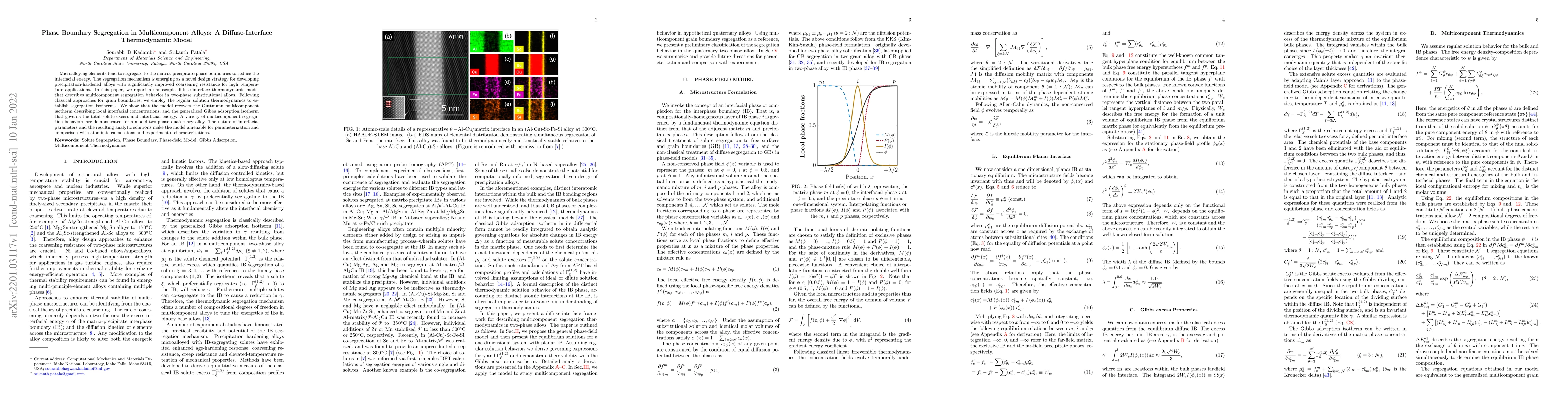 This paper presents a diffuse-interface thermodynamic model to describe multicomponent segregation behavior at phase boundaries in two-phase substitutional alloys, employing regular solution thermodynamics to establish segregation isotherms. The model demonstrates various segregation behaviors in a quaternary alloy, showing potential for parameterization and comparison with atomistic and experimental data.