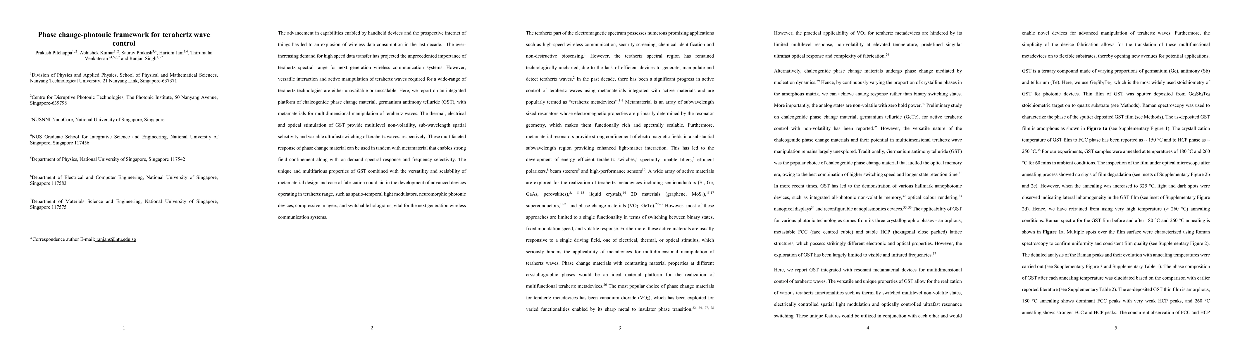 The advancement in capabilities enabled by handheld devices and the prospective internet of things has led to an explosion of wireless data consumption in the last decade. The ever-increasing demand for high speed data transfer has projected the unprecedented importance of terahertz spectral range for next generation wireless communication systems. However, versatile interaction and active manipulation of terahertz waves required for a wide-range of terahertz technologies are either unavailable or unscalable. Here, we report on an integrated platform of chalcogenide phase change material, germanium antimony telluride (GST), with metamaterials for multidimensional manipulation of terahertz waves. The thermal, electrical and optical stimulation of GST provide multilevel non-volatility, sub-wavelength spatial selectivity and variable ultrafast switching of terahertz waves, respectively. These multifaceted response of phase change material can be used in tandem with metamaterial that enables strong field confinement along with on-demand spectral response and frequency selectivity. The unique and multifarious properties of GST combined with the versatility and scalability of metamaterial design and ease of fabrication could aid in the development of advanced devices operating in terahertz range, such as spatio-temporal light modulators, neuromorphic photonic devices, compressive imagers, and switchable holograms, vital for the next generation wireless communication systems.