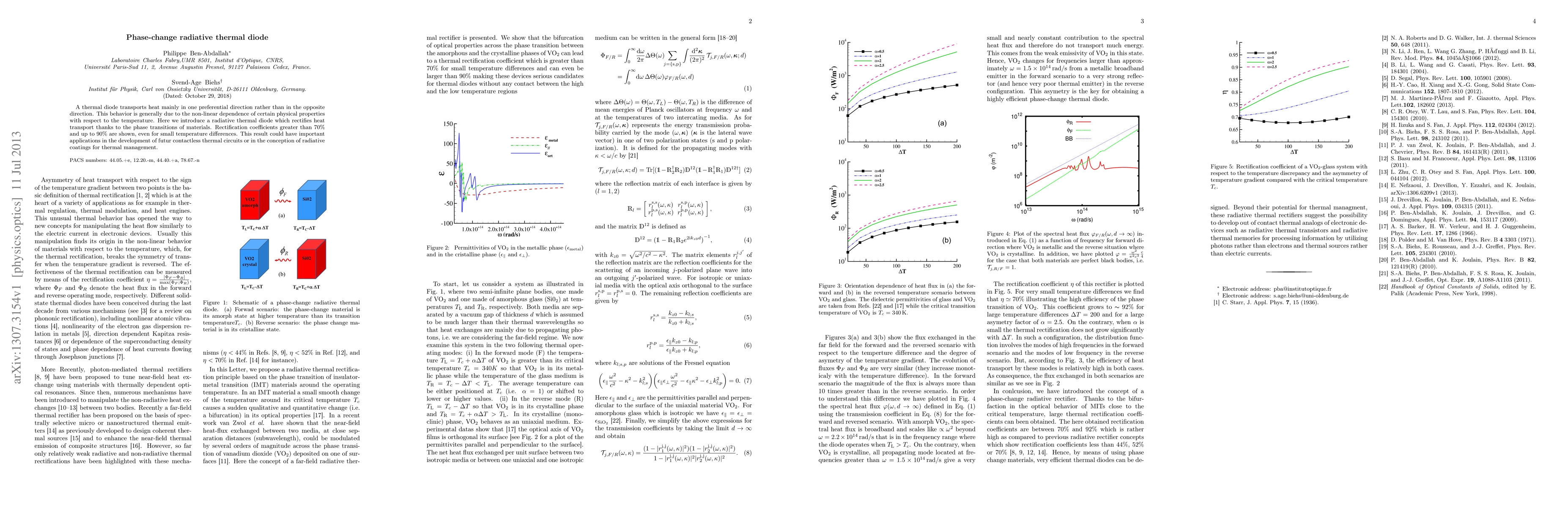 This paper introduces a phase-change radiative thermal diode that rectifies heat transport through material phase transitions, achieving rectification coefficients over 70% and up to 90%. Potential applications include contactless thermal circuits and thermal management coatings.