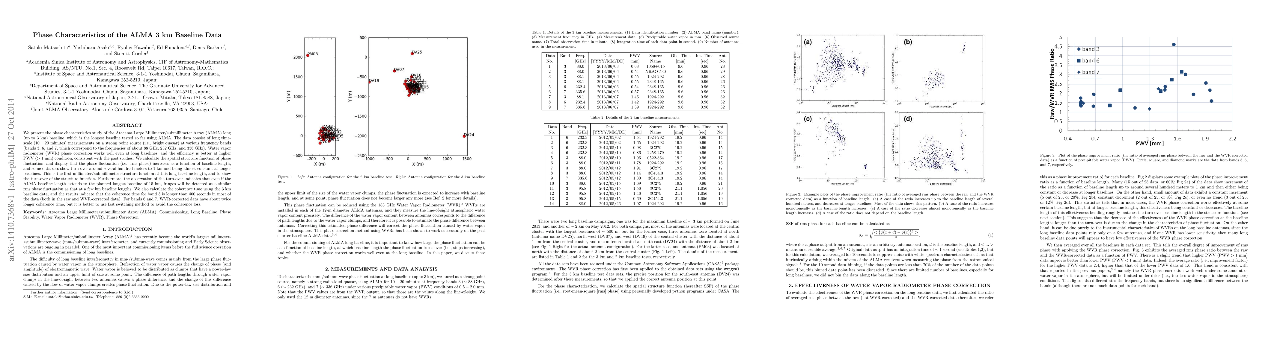 We present the phase characteristics study of the Atacama Large Millimeter/submillimeter Array (ALMA) long (up to 3 km) baseline, which is the longest baseline tested so far using ALMA. The data consist of long time-scale (10 - 20 minutes) measurements on a strong point source (i.e., bright quasar) at various frequency bands (bands 3, 6, and 7, which correspond to the frequencies of about 88 GHz, 232 GHz, and 336 GHz). Water vapor radiometer (WVR) phase correction works well even at long baselines, and the efficiency is better at higher PWV (>1 mm) condition, consistent with the past studies. We calculate the spatial structure function of phase fluctuation, and display that the phase fluctuation (i.e., rms phase) increases as a function of baseline length, and some data sets show turn-over around several hundred meters to 1 km and being almost constant at longer baselines. This is the first millimeter/submillimeter structure function at this long baseline length, and to show the turn-over of the structure function. Furthermore, the observation of the turn-over indicates that even if the ALMA baseline length extends to the planned longest baseline of 15 km, fringes will be detected at a similar rms phase fluctuation as that at a few km baseline lengths. We also calculate the coherence time using the 3 km baseline data, and the results indicate that the coherence time for band 3 is longer than 400 seconds in most of the data (both in the raw and WVR-corrected data). For bands 6 and 7, WVR-corrected data have about twice longer coherence time, but it is better to use fast switching method to avoid the coherence loss.
