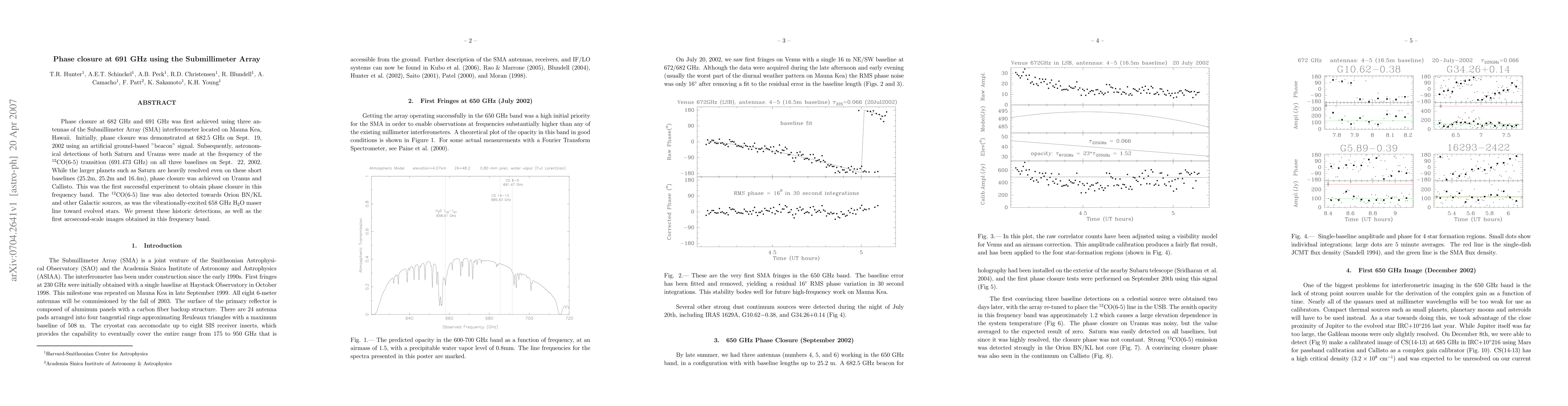 This paper reports the first successful phase closure at 691 GHz using the Submillimeter Array (SMA) interferometer, achieving astronomical detections of Saturn, Uranus, and Callisto. It also presents the first arcsecond-scale images in this frequency band, including detections of CO(6-5) lines and water maser lines.