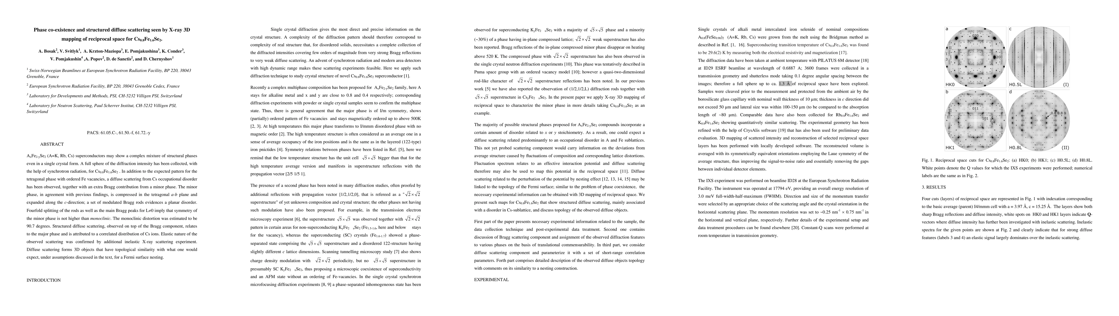 This study uses synchrotron X-ray 3D mapping to reveal phase co-existence in Cs0.8Fe1.6Se2, identifying a minor monoclinic phase alongside the tetragonal phase and diffuse scattering due to Cs disorder. The findings suggest a correlated distribution of Cs ions and topological similarities with Fermi surface nesting.