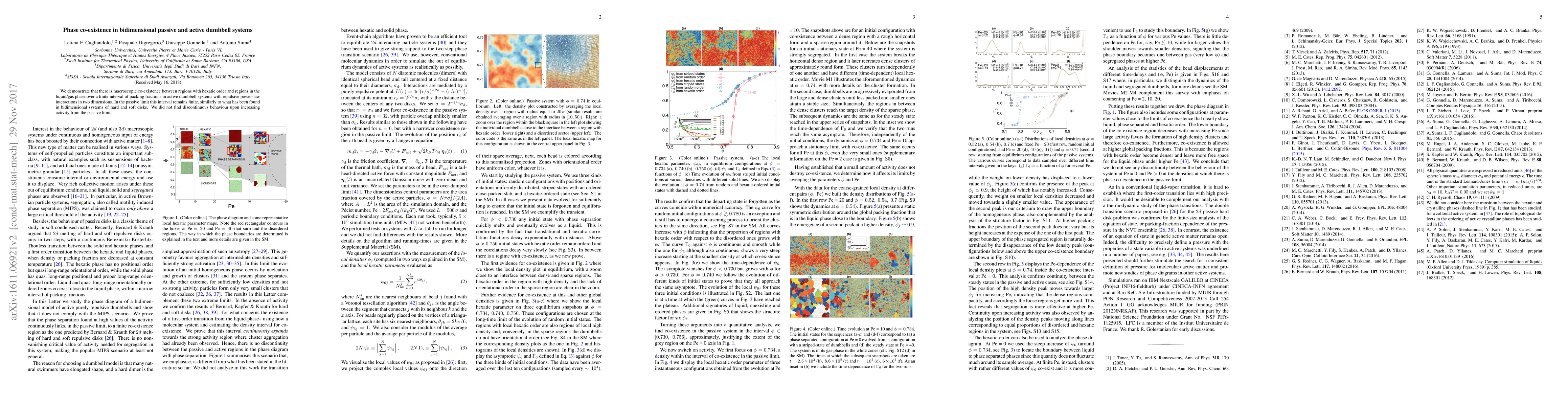 This paper investigates phase co-existence in bidimensional passive and active dumbbell systems, showing that hexatic order regions coexist with liquid/gas phases over a finite packing fraction range. The study finds no discontinuous behavior transitioning from passive to active systems, mirroring findings in similar bidimensional systems.