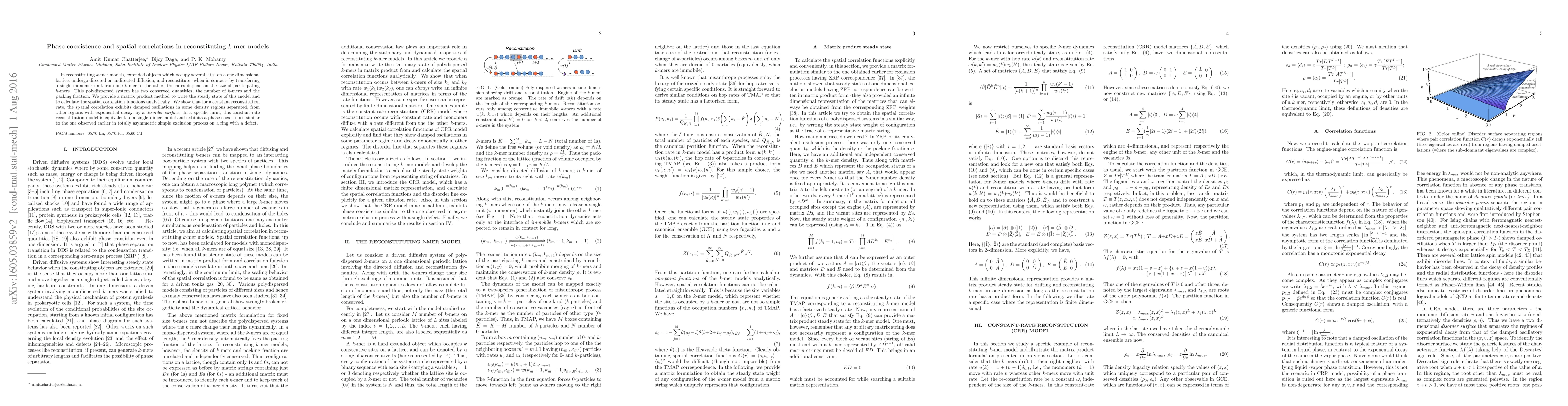 In reconstituting k-mer models, extended objects which occupy several sites on a one dimensional lattice, undergo directed or undirected diffusion, and reconstitute -when in contact- by transferring a single monomer unit from one k-mer to the other; the rates depend on the size of participating k-mers. This polydispersed system has two conserved quantities, the number of k-mers and the packing fraction. We provide a matrix product method to write the steady state of this model and to calculate the spatial correlation functions analytically. We show that for a constant reconstitution rate, the spatial correlation exhibits damped oscillations in some density regions separated, from other regions with exponential decay, by a disorder surface. In a specific limit, this constant-rate reconstitution model is equivalent to a single dimer model and exhibits a phase coexistence similar to the one observed earlier in totally asymmetric simple exclusion process on a ring with a defect.