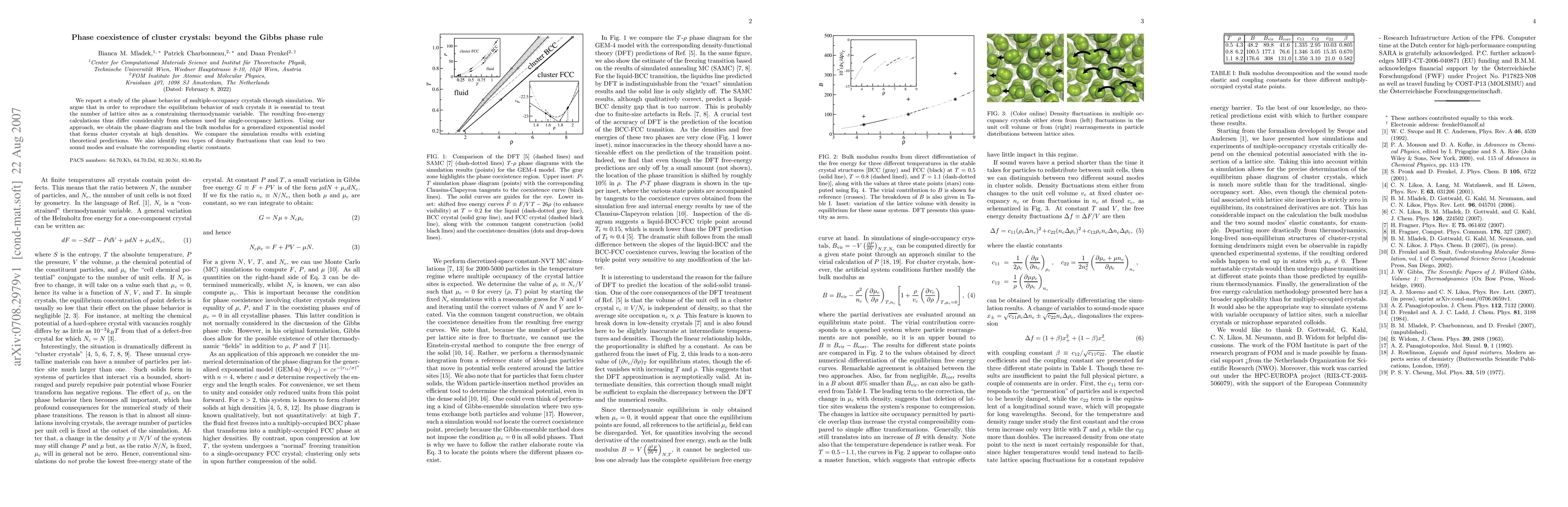 Researchers used simulation to study phase behavior of cluster crystals, finding that treating lattice sites as a constraining variable is essential for accurate free-energy calculations, and identified two types of density fluctuations leading to sound modes.