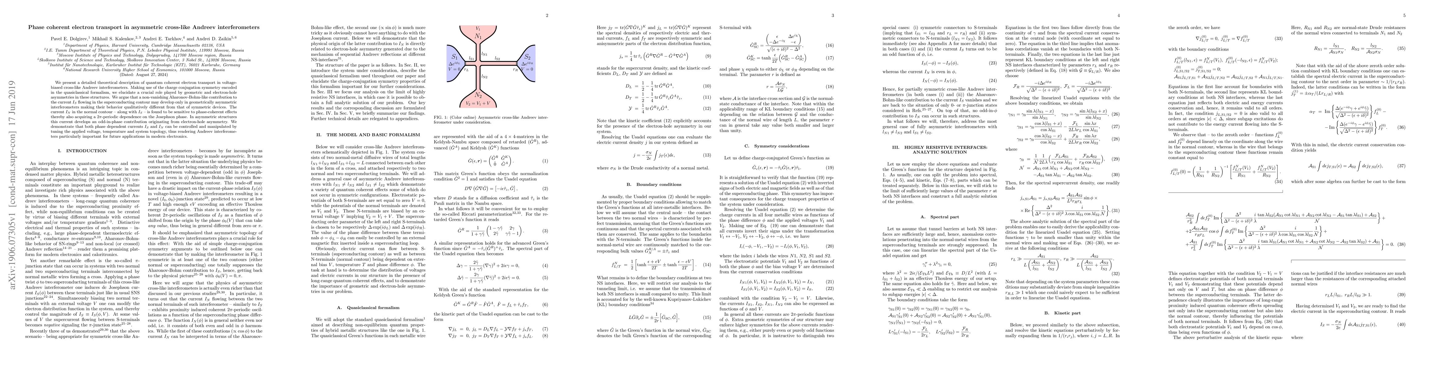 This paper explores quantum coherent electron transport in asymmetric cross-like Andreev interferometers, revealing that geometric and electron-hole asymmetries lead to unique phase-dependent current behaviors. It shows that phase-coherent effects and topological control can manipulate currents, highlighting the potential of these devices in future electronic applications.