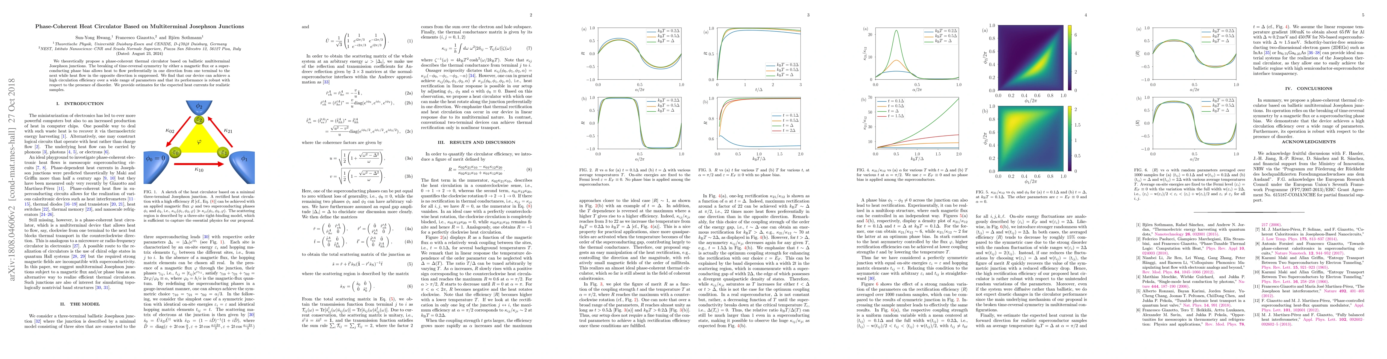 This paper proposes a theoretical phase-coherent thermal circulator utilizing ballistic multiterminal Josephson junctions, where time-reversal symmetry is broken to allow unidirectional heat flow. The device demonstrates high circulation efficiency and robustness against disorder, with estimates for practical heat current levels.