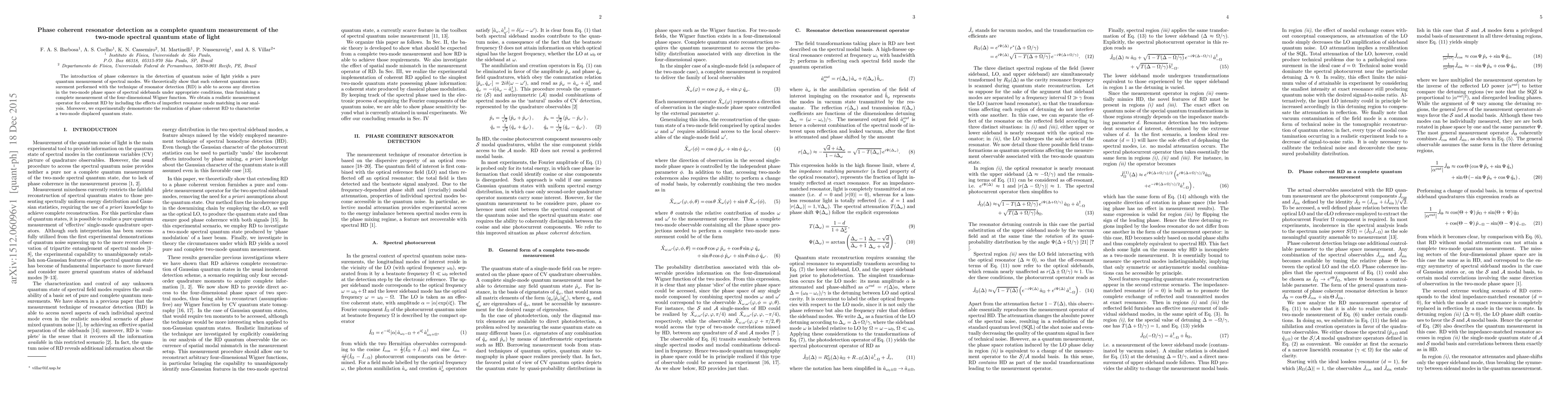 This paper theoretically and experimentally demonstrates that phase coherent resonator detection can fully measure the quantum state of two-mode light by accessing all directions in the phase space, providing a complete Wigner function measurement, even with imperfect resonator mode matching. The technique is validated through experimental characterization of a two-mode displaced quantum state.