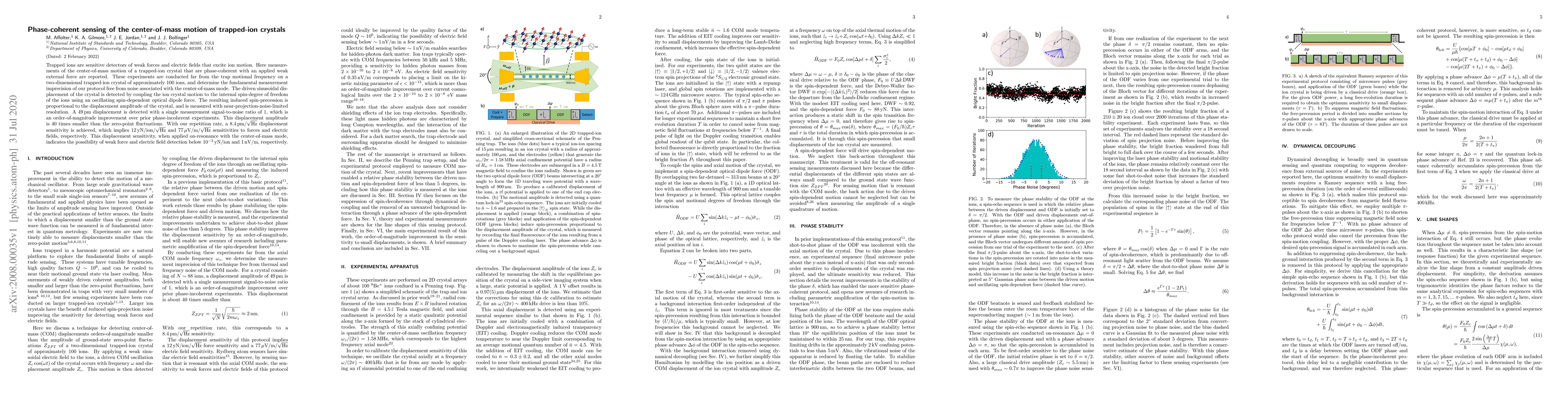 This paper reports phase-coherent measurements of the center-of-mass motion in a trapped-ion crystal, achieving a displacement sensitivity of $49\,$pm with a single measurement. The method detects ion crystal motion by coupling it to the internal spin-degree of freedom, leading to a sensitivity that could detect forces as low as $10^{-3}\,$yN/ion and electric fields as small as $1\,$nV/m.