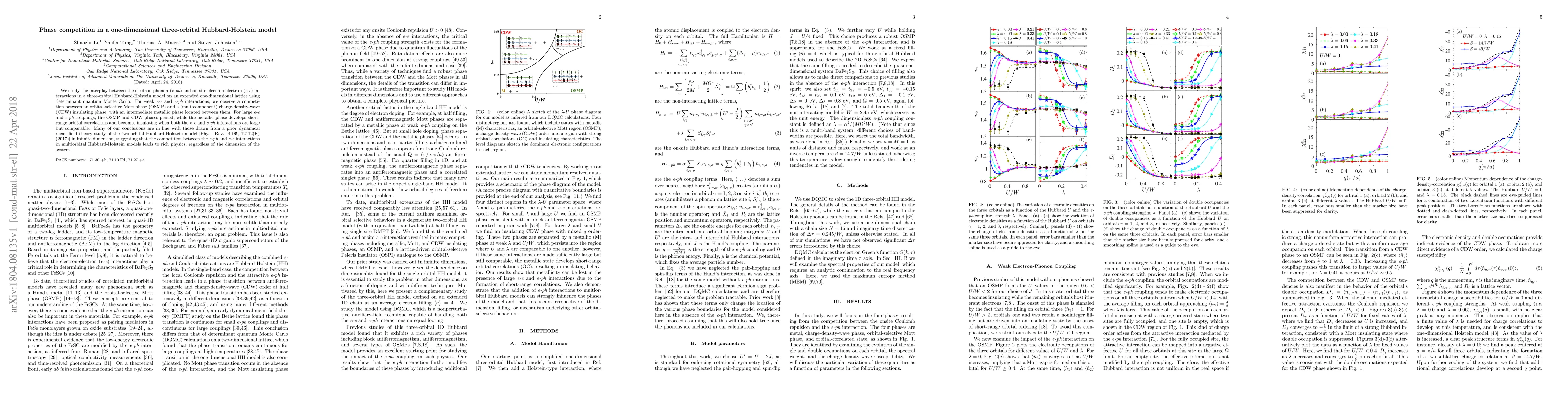 We study the interplay between the electron-phonon (e-ph) and on-site electron-electron (e-e) interactions in a three-orbital Hubbard-Holstein model on an extended one-dimensional lattice using determinant quantum Monte Carlo. For weak e-e and e-ph interactions, we observe a competition between an orbital-selective Mott phase (OSMP) and a (multicomponent) charge-density-wave (CDW) insulating phase, with an intermediate metallic phase located between them. For large e-e and e-ph couplings, the OSMP and CDW phases persist, while the metallic phase develops short-range orbital correlations and becomes insulating when both the e-e and e-ph interactions are large but comparable. Many of our conclusions are in line with those drawn from a prior dynamical mean field theory study of the two-orbital Hubbard-Holstein model [Phys. Rev. B 95, 12112(R) (2017)] in infinite dimension, suggesting that the competition between the e-ph and e-e interactions in multiorbital Hubbard-Holstein models leads to rich physics, regardless of the dimension of the system.