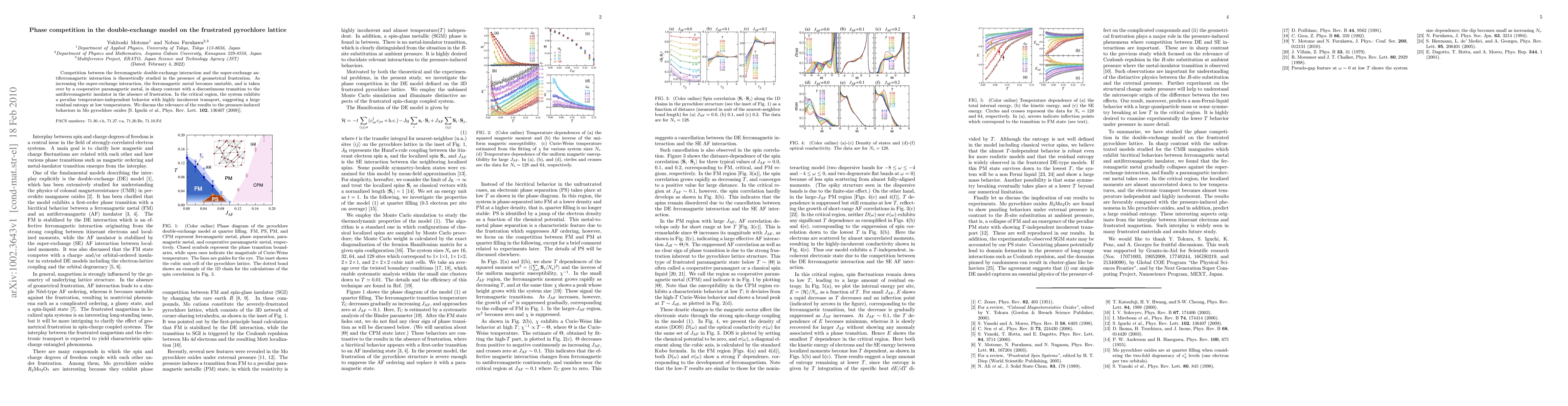 This paper investigates the interplay between ferromagnetic double-exchange and antiferromagnetic super-exchange interactions on a frustrated pyrochlore lattice, revealing a transition from ferromagnetic metal to a cooperative paramagnetic metal with increasing antiferromagnetic interaction. The study highlights unusual temperature-independent behavior and high residual entropy, relevant to pressure-induced phenomena in Mo pyrochlore oxides.