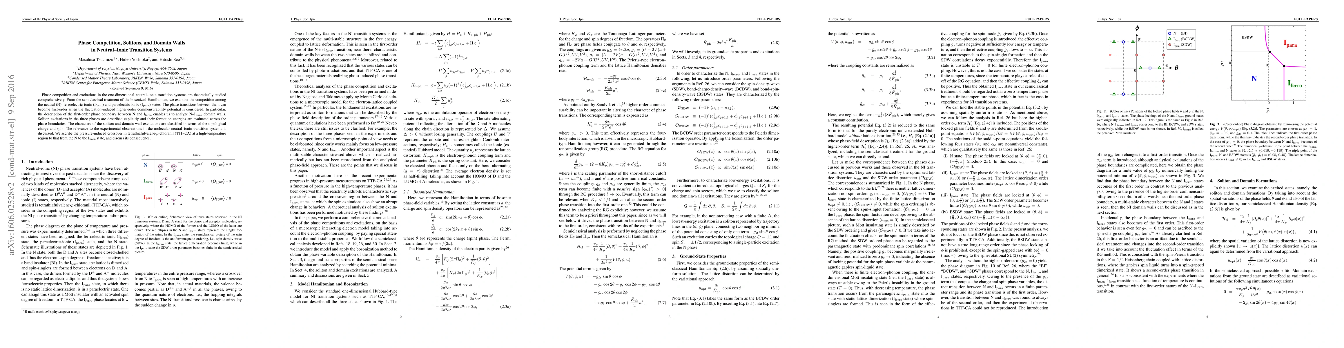 This paper theoretically investigates phase competition and solitons in one-dimensional neutral-ionic transition systems, focusing on the first-order phase transitions between neutral, ferroelectric-ionic, and paraelectric-ionic states. It analyzes N-I$_\mathrm{ferro}$ domain walls and classifies soliton and domain-wall excitations by topological charge and spin, with implications for experimental observations in molecular systems like TTF-CA.
