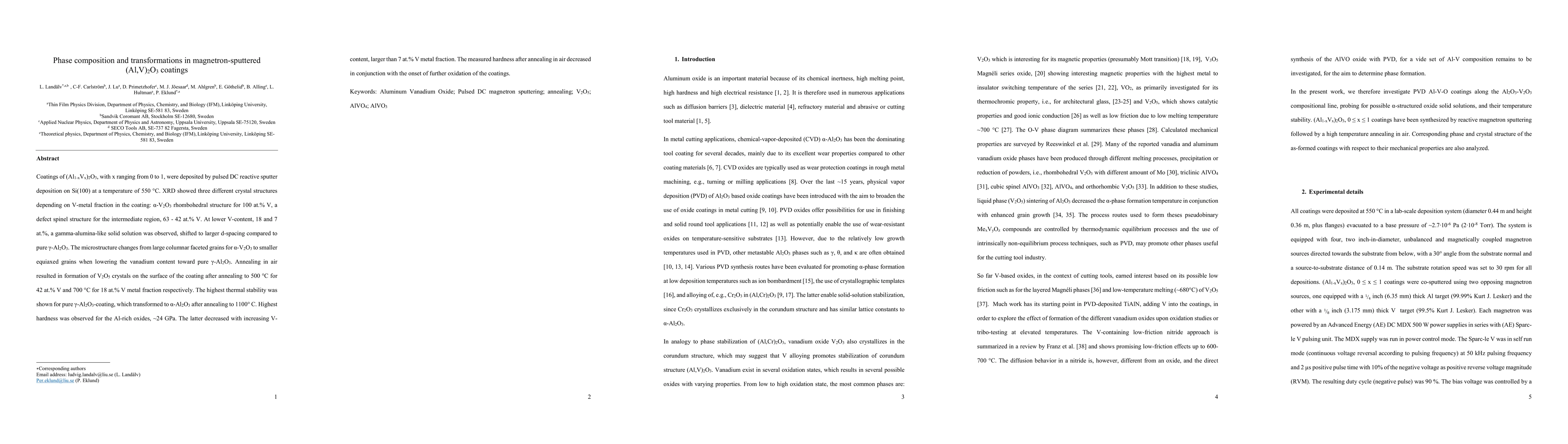 This study investigates (Al,V)2O3 coatings deposited via pulsed DC reactive sputtering, revealing three distinct crystal structures based on vanadium content: α-V2O3, defect spinel, and γ-alumina-like solid solution. The coatings exhibit varying microstructures and hardness, with the highest hardness (~24 GPa) in Al-rich compositions, decreasing with higher vanadium content.