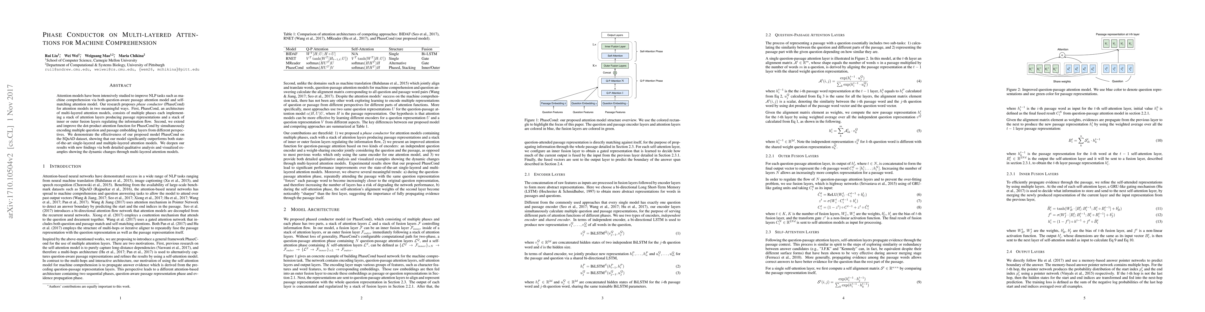 Attention models have been intensively studied to improve NLP tasks such as machine comprehension via both question-aware passage attention model and self-matching attention model. Our research proposes phase conductor (PhaseCond) for attention models in two meaningful ways. First, PhaseCond, an architecture of multi-layered attention models, consists of multiple phases each implementing a stack of attention layers producing passage representations and a stack of inner or outer fusion layers regulating the information flow. Second, we extend and improve the dot-product attention function for PhaseCond by simultaneously encoding multiple question and passage embedding layers from different perspectives. We demonstrate the effectiveness of our proposed model PhaseCond on the SQuAD dataset, showing that our model significantly outperforms both state-of-the-art single-layered and multiple-layered attention models. We deepen our results with new findings via both detailed qualitative analysis and visualized examples showing the dynamic changes through multi-layered attention models.