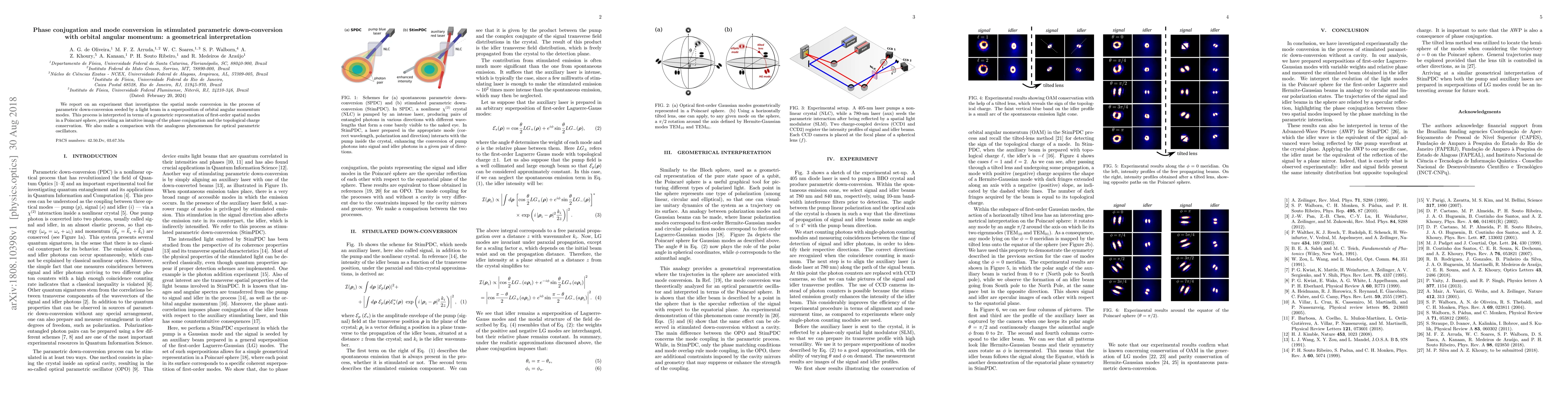 This paper experiments with spatial mode conversion in stimulated parametric down-conversion, using light beams with orbital angular momentum, and geometrically interprets the process through a Poincaré sphere to demonstrate phase conjugation and topological charge conservation. It compares these findings with optical parametric oscillators.