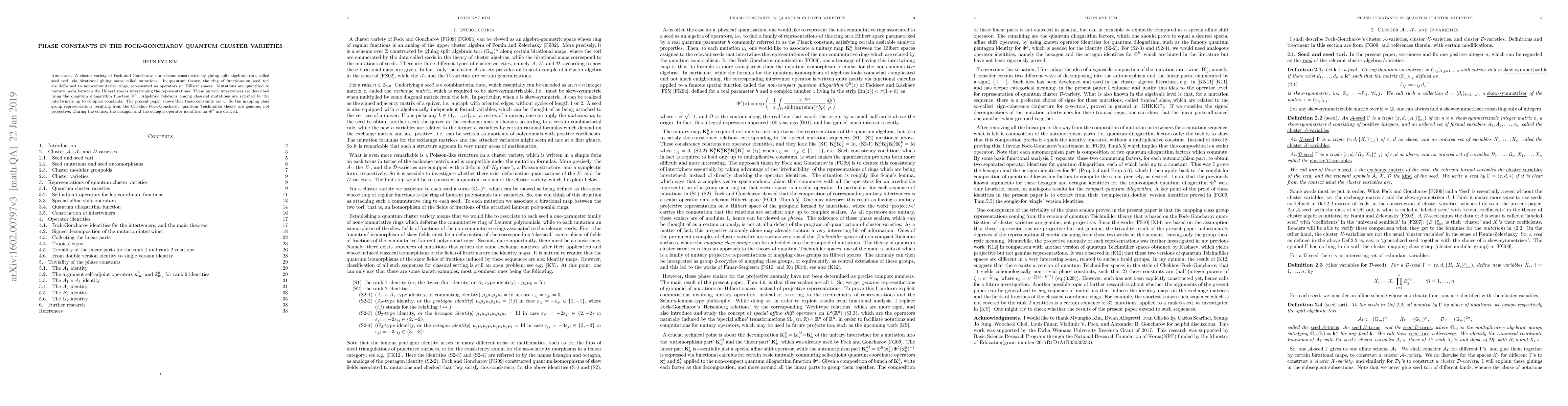 This paper examines the quantum cluster varieties of Fock and Goncharov, demonstrating that the phase constants in the quantum mutation maps are exactly $1$, ensuring genuine representations in the Chekhov-Fock-Goncharov quantum Teichmüller theory, and derives the hexagon and octagon identities for the quantum dilogarithm function $\Phi^\hbar$.