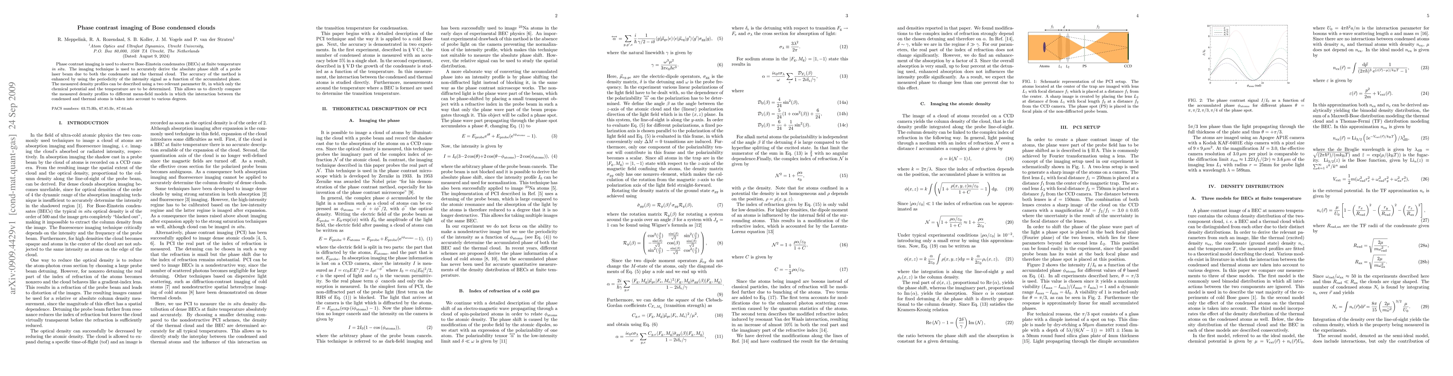 Phase contrast imaging is used to observe Bose-Einstein condensates (BECs) at finite temperature in situ. The imaging technique is used to accurately derive the absolute phase shift of a probe laser beam due to both the condensate and the thermal cloud. The accuracy of the method is enhanced by using the periodicity of the intensity signal as a function of the accumulated phase. The measured density profiles can be described using a two relevant parameter fit, in which only the chemical potential and the temperature are to be determined. This allows us to directly compare the measured density profiles to different mean-field models in which the interaction between the condensed and thermal atoms is taken into account to various degrees.