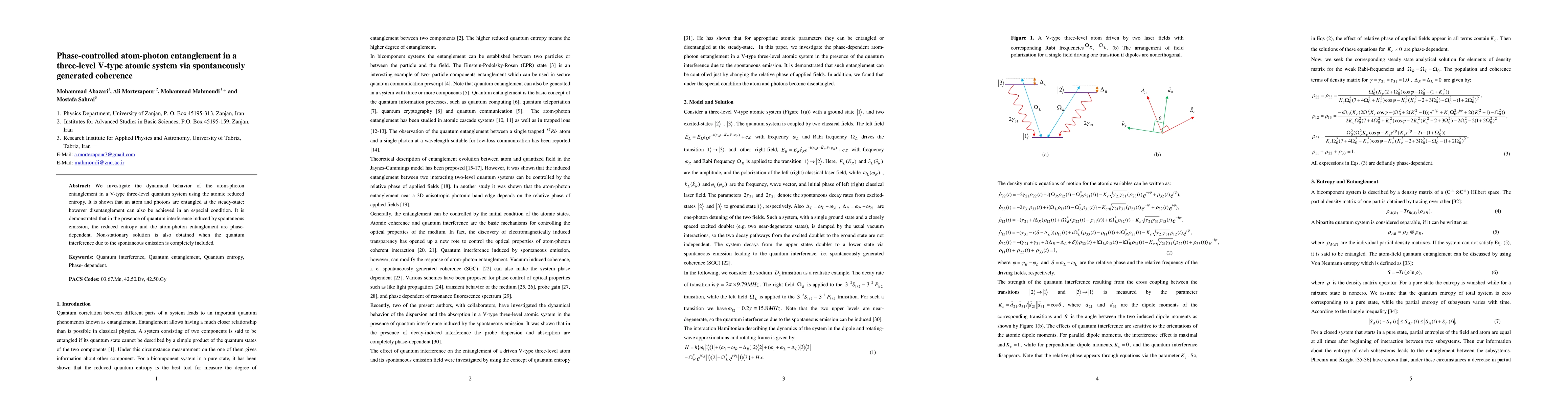 This paper explores atom-photon entanglement dynamics in a V-type three-level quantum system, revealing phase-dependent entanglement and disentanglement conditions, with quantum interference from spontaneous emission affecting the reduced entropy and entanglement. Non-stationary solutions emerge under complete quantum interference.