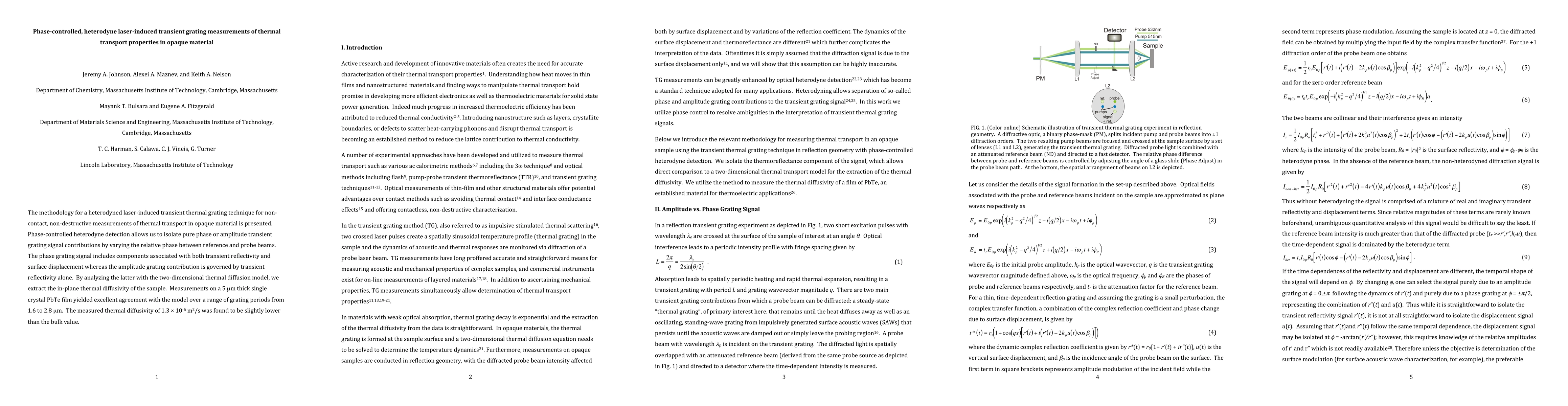 The methodology for a heterodyned laser-induced transient thermal grating technique for non-contact, non-destructive measurements of thermal transport in opaque material is presented. Phase-controlled heterodyne detection allows us to isolate pure phase or amplitude transient grating signal contributions by varying the relative phase between reference and probe beams. The phase grating signal includes components associated with both transient reflectivity and surface displacement whereas the amplitude grating contribution is governed by transient reflectivity alone. By analyzing the latter with the two-dimensional thermal diffusion model, we extract the in-plane thermal diffusivity of the sample. Measurements on a 5 {\mu}m thick single crystal PbTe film yielded excellent agreement with the model over a range of grating periods from 1.6 to 2.8 {\mu}m. The measured thermal diffusivity of 1.3 \times 10-6 m2/s was found to be slightly lower than the bulk value.