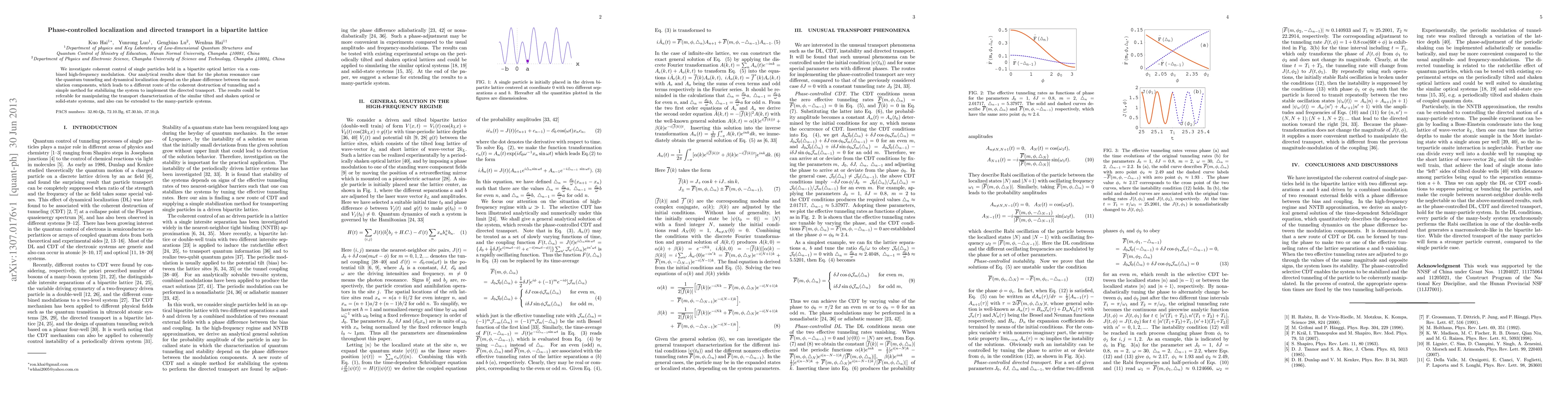 This paper explores the coherent control of single particles in a bipartite optical lattice using high-frequency modulation, demonstrating that the phase difference between modulation components influences quantum tunneling and dynamical localization. The findings propose a method for stabilizing the system and achieving directed transport, applicable to similar optical and solid-state systems.