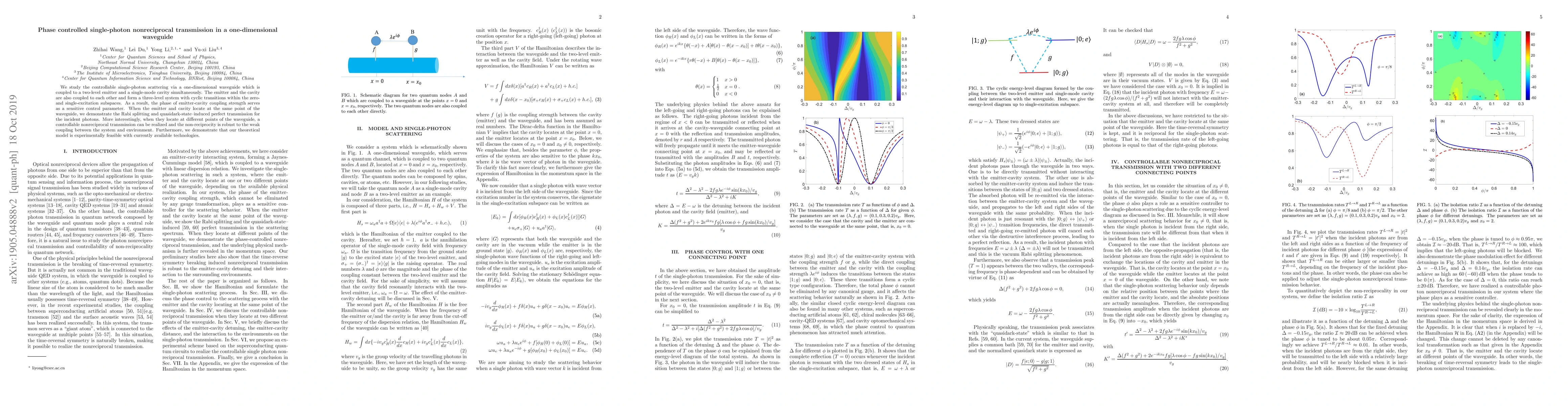 This paper investigates single-photon nonreciprocal transmission in a one-dimensional waveguide coupled to a two-level emitter and a cavity, showing phase-controlled scattering. The system exhibits perfect transmission and controllable nonreciprocity, which is robust against weak environmental coupling, and the proposed model is deemed experimentally feasible with current technology.