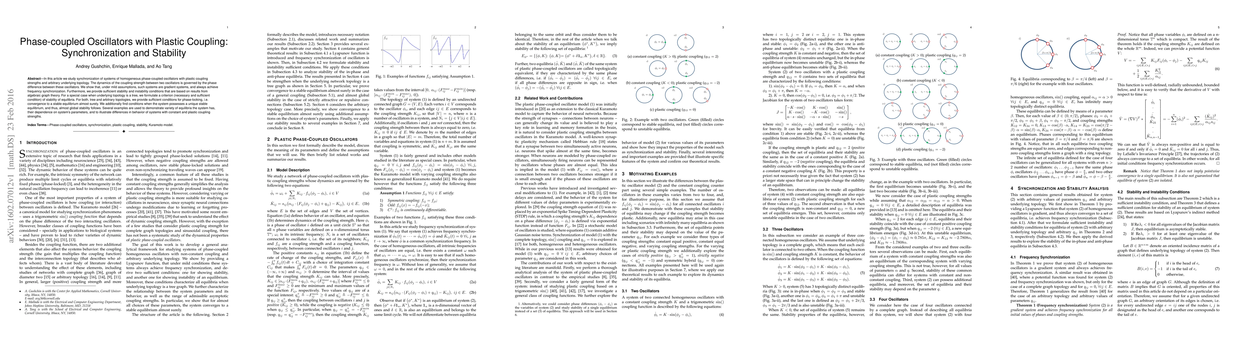 This paper explores the synchronization and stability of phase-coupled oscillators with adaptable coupling strengths, demonstrating that such systems achieve frequency synchronization and providing stability conditions based on algebraic graph theory. It also establishes criteria for stability and phase-locking, particularly for tree topologies.