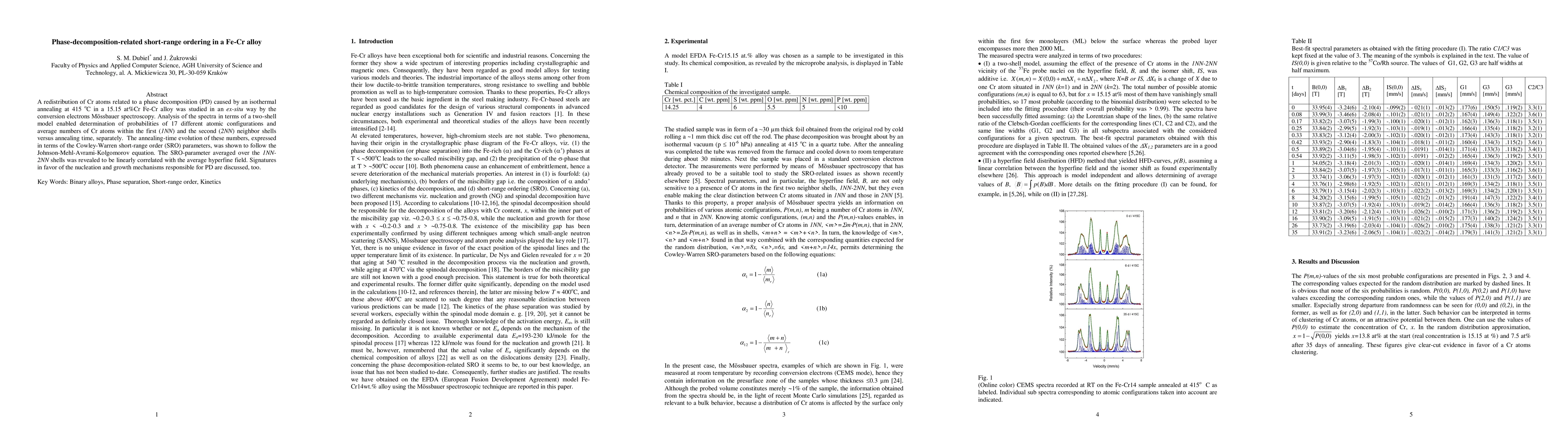 Researchers used M"ossbauer spectroscopy to study a Fe-Cr alloy's phase decomposition after isothermal annealing at 415 C, revealing a linear correlation between short-range order parameters and the average hyperfine field.