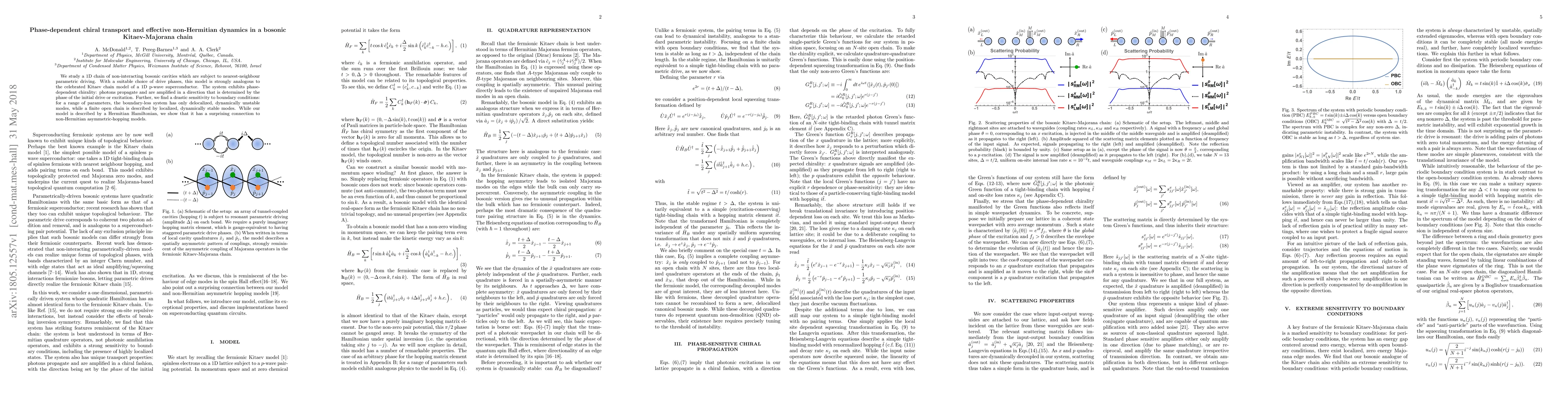 This paper investigates a bosonic chain with parametric driving, analogous to the Kitaev chain, showing phase-dependent chiral transport where photon propagation direction is determined by drive phase. It reveals a sensitivity to boundary conditions, with stable localized modes in finite chains, and connects Hermitian dynamics to non-Hermitian asymmetric-hopping models.