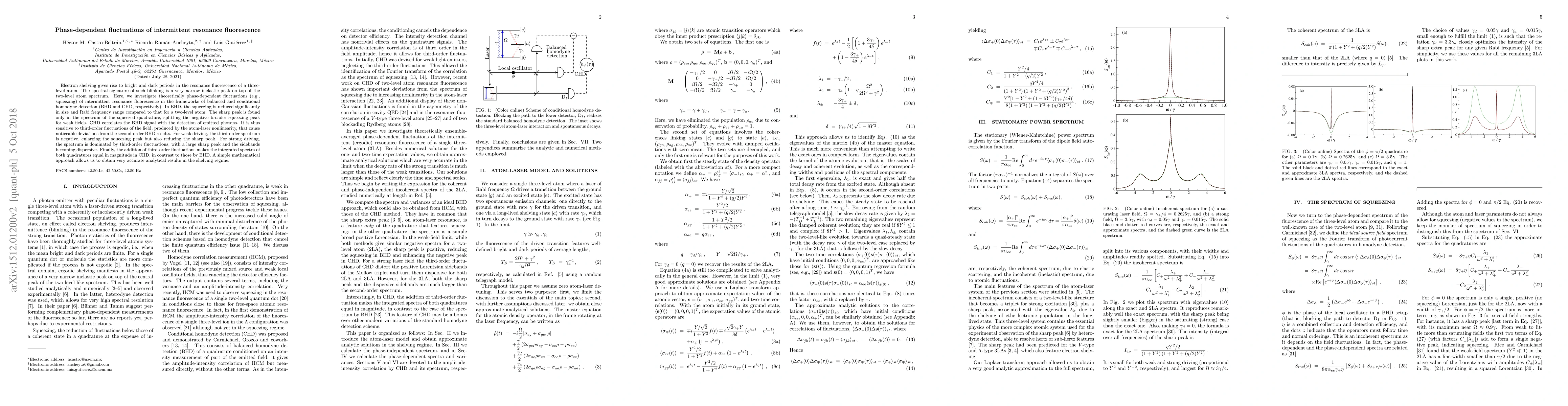 This paper investigates phase-dependent fluctuations in intermittent resonance fluorescence from a three-level atom, revealing a narrow inelastic peak in the incoherent spectrum. The study shows that balanced homodyne detection reduces squeezing due to a positive sharp peak, while conditional homodyne detection enhances squeezing for weak to moderate laser intensities, and introduces dispersive effects for strong fields.