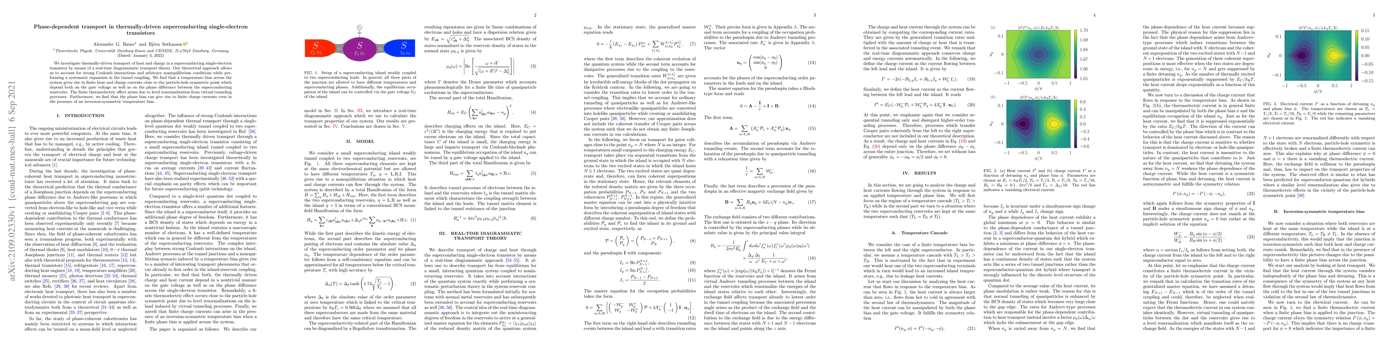 This paper explores thermally-driven transport in superconducting single-electron transistors, revealing that temperature and phase biases induce finite heat and charge currents near the particle-hole symmetric point. The study employs a real-time diagrammatic transport theory to account for strong interactions and nonequilibrium conditions.