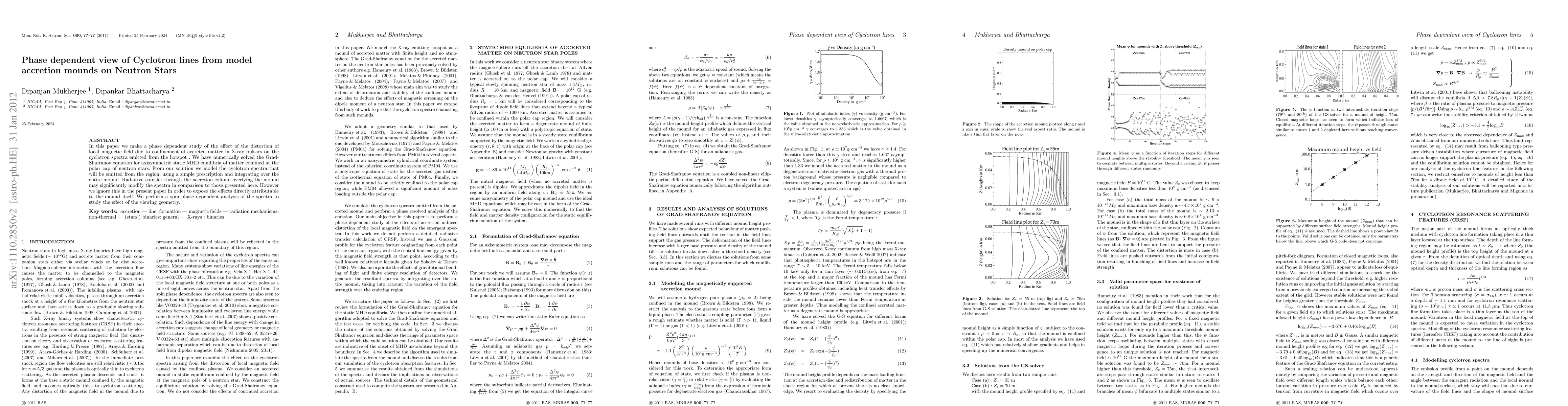 In this paper we make a phase dependent study of the effect of the distortion of local magnetic field due to confinement of accreted matter in X-ray pulsars on the cyclotron spectra emitted from the hotspot . We have numerically solved the Grad-Shafranov equation for axisymmetric static MHD equilibria of matter confined at the polar cap of neutron stars. From our solution we model the cyclotron spectra that will be emitted from the region, using a simple prescription and integrating over the entire mound. Radiative transfer through the accretion column overlying the mound may significantly modify the spectra in comparison to those presented here. However we ignore this in the present paper in order to expose the effects directly attributable to the mound itself. We perform a spin phase dependent analysis of the spectra to study the effect of the viewing geometry.