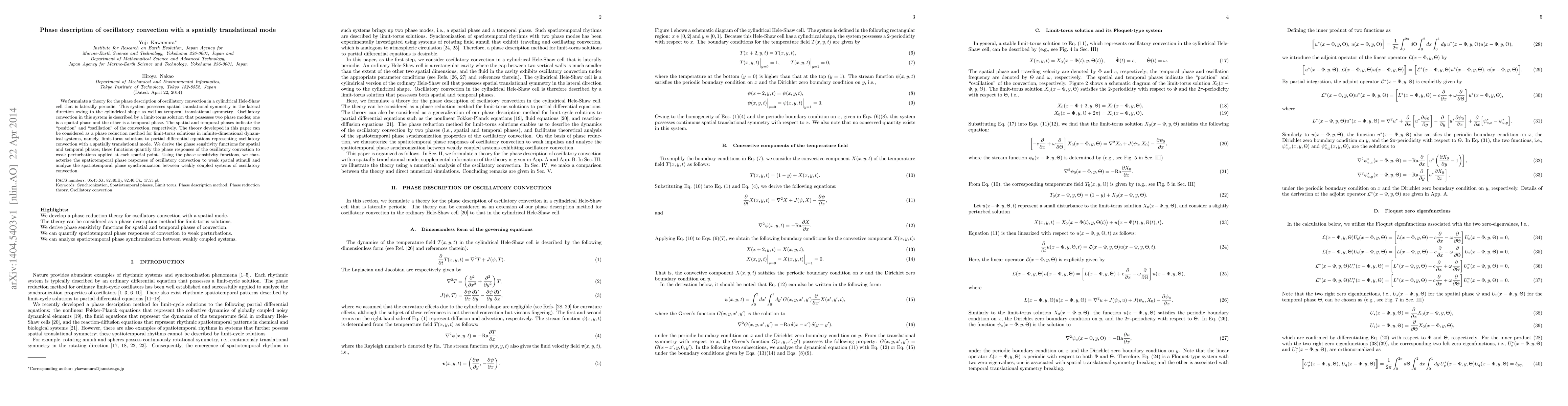 This paper develops a theory for oscillatory convection in a cylindrical Hele-Shaw cell, describing it through phase modes that represent spatial and temporal positions. The study introduces phase sensitivity functions to quantify responses to weak perturbations and analyzes phase synchronization between coupled systems.