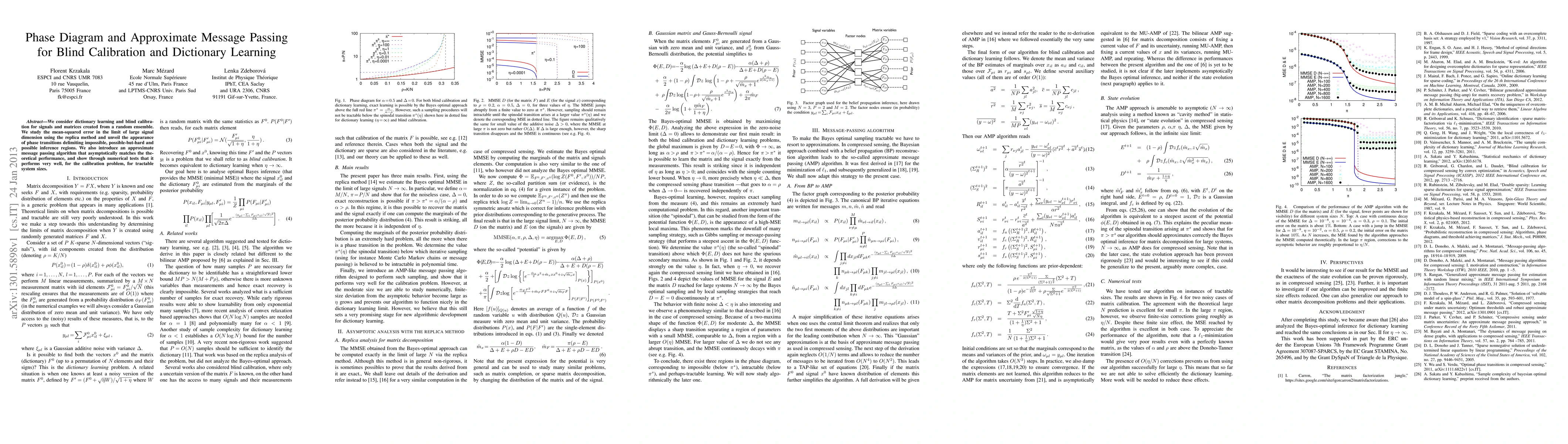 This paper investigates dictionary learning and blind calibration for random signals and matrices, revealing phase transitions in mean-squared error using the replica method. It introduces an approximate message passing algorithm that matches theoretical performance and performs well in numerical tests for practical system sizes.