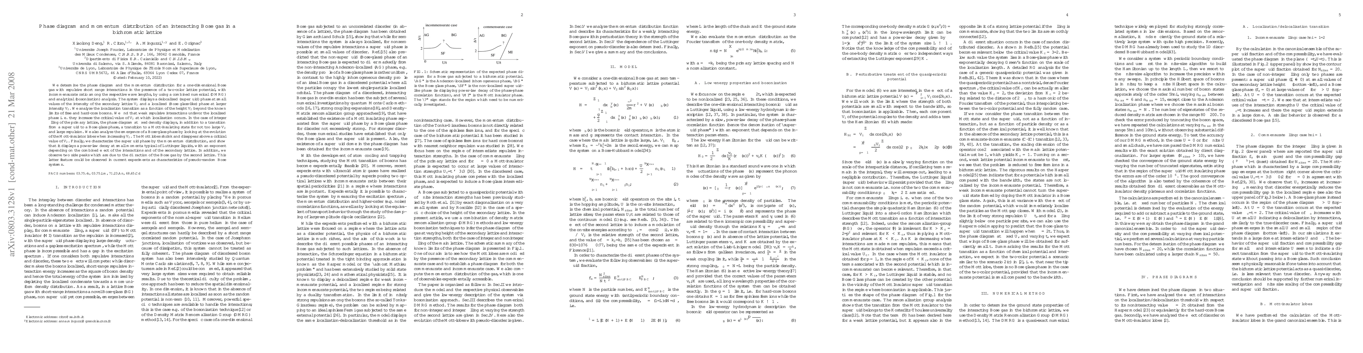 The research explores the phase diagram and momentum distribution of a one-dimensional Bose gas with repulsive interactions in a bichromatic lattice, revealing a transition from a superfluid to a localized Bose glass phase. Weak interactions elevate the critical threshold for localization. At integer filling, a transition to a Mott-insulating state occurs for moderate secondary lattice intensity and strong repulsion. The momentum distribution shows a Luttinger liquid-like power-law decay, with discernible side peaks due to secondary lattice diffraction.
