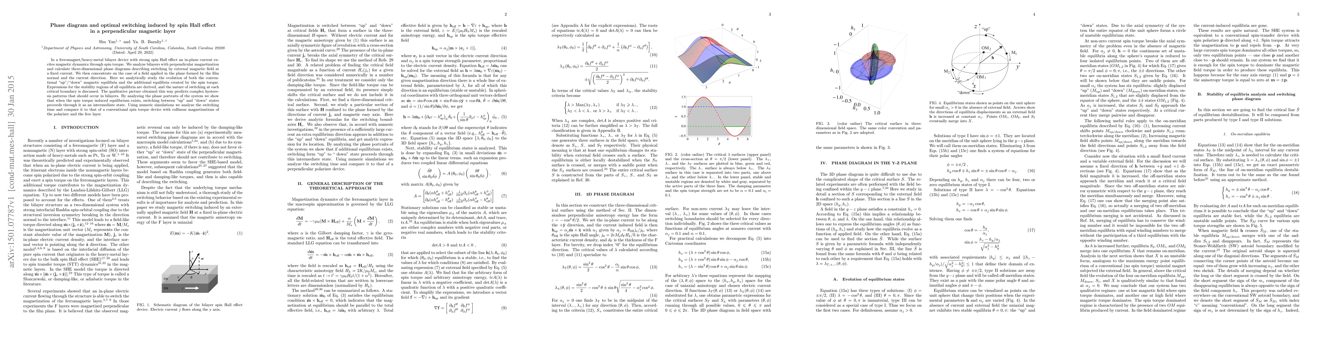 This paper investigates the magnetic dynamics in a ferromagnet/heavy-metal bilayer driven by the spin Hall effect, focusing on phase diagrams and optimal switching conditions. It derives expressions for stability regions of various magnetic equilibria and predicts complex hysteresis patterns, showing that switching through spin torque can occur via an intermediate state.