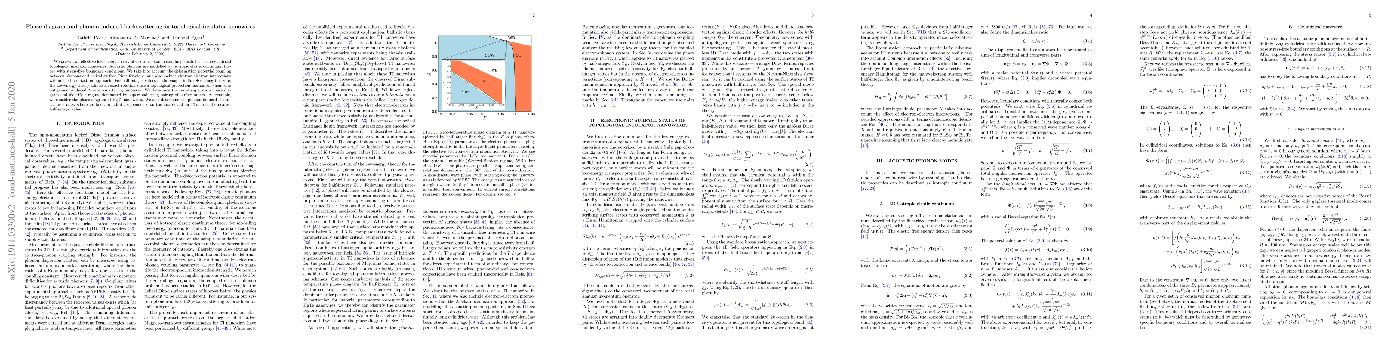 This paper presents an effective theory for electron-phonon coupling in topological insulator nanowires, revealing that topological protection prevents phonon-induced backscattering at half-integer magnetic flux values. It determines the zero-temperature phase diagram and identifies a superconducting pairing regime, along with a quadratic resistivity dependence on flux deviation.